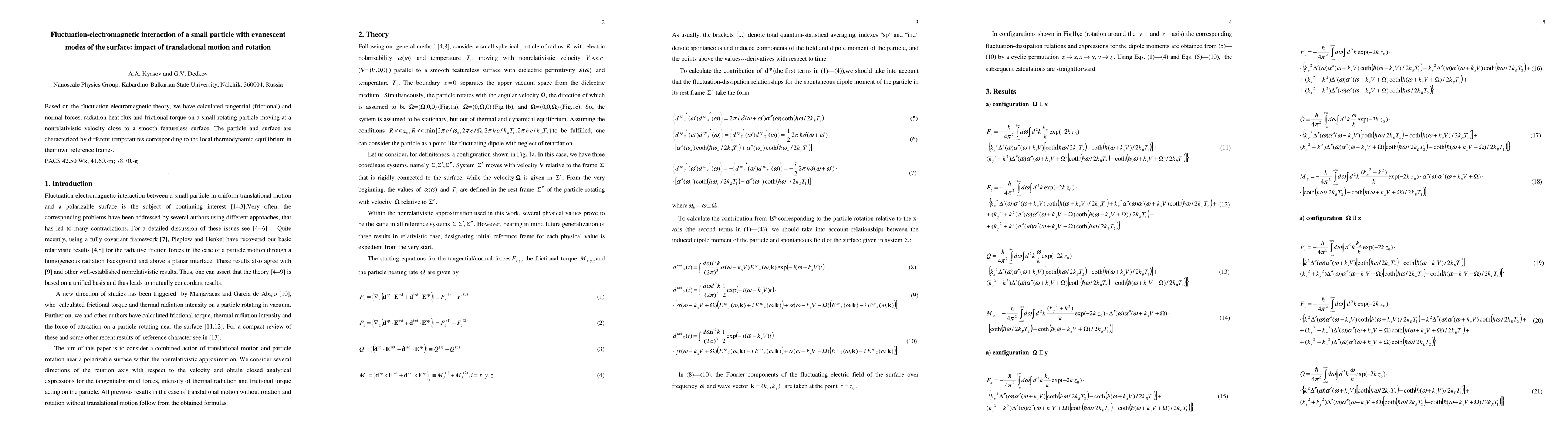 Summary: This paper calculates tangential and normal forces, radiation heat flux, and frictional torque on a small rotating particle near a surface using fluctuation-electromagnetic theory, considering the effects of translational motion, rotation, and differing temperatures.