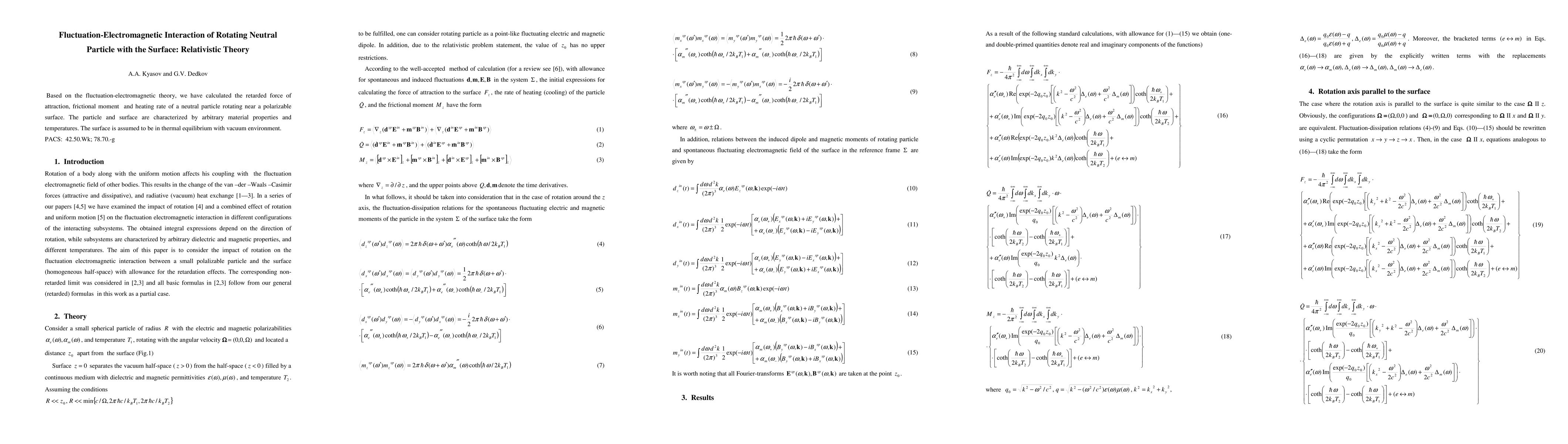 Based on the fluctuation-electromagnetic theory, we have calculated the retarded force of attraction, frictional moment and heating rate of a neutral particle rotating near a polarizable surface. The particle and surface are characterized by arbitrary material properties and temperatures. The surface is assumed to be in thermal equilibrium with vacuum environment.