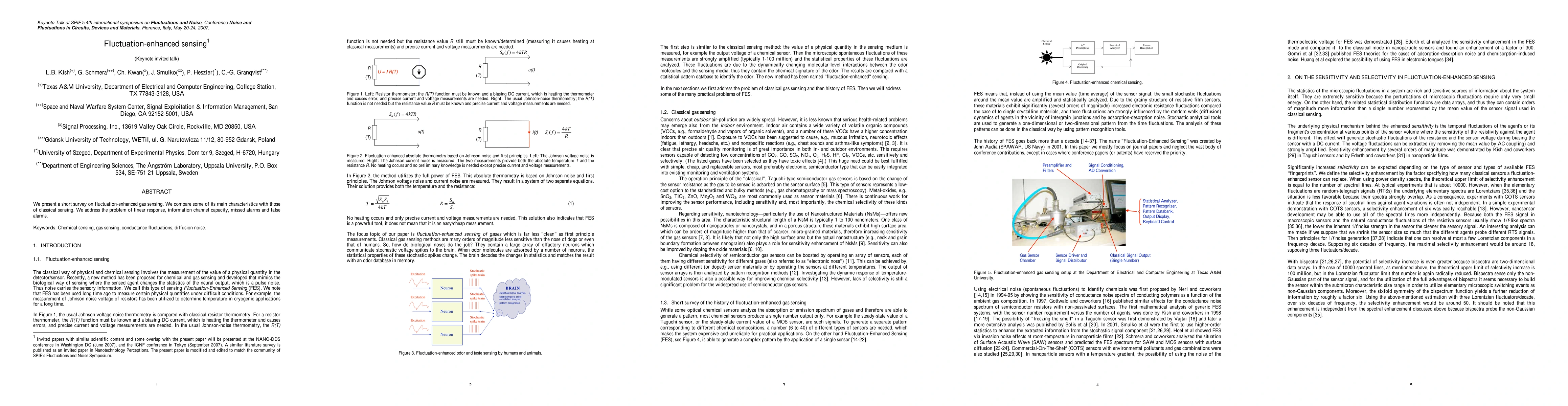 Summary: This paper surveys fluctuation-enhanced gas sensing, comparing it to classical sensing methods, and discusses issues like linear response, information channel capacity, and the balance between missed and false alarms. The study highlights the potential advantages and challenges of this advanced sensing technique.