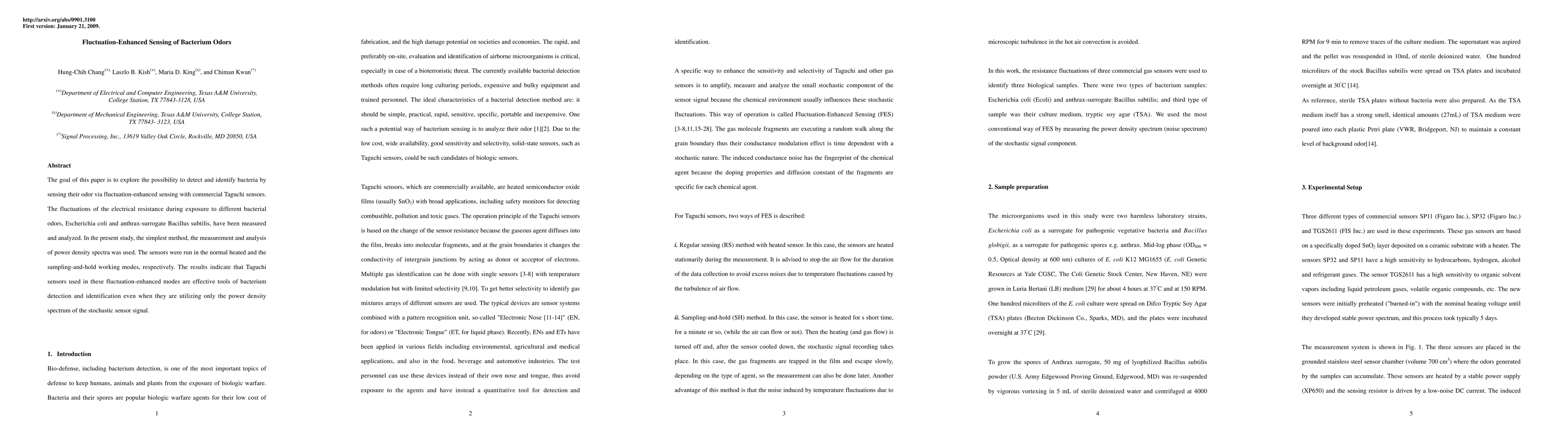 The goal of this paper is to explore the possibility to detect and identify bacteria by sensing their odor via fluctuation-enhanced sensing with commercial Taguchi sensors. The fluctuations of the electrical resistance during exposure to different bacterial odors, Escherichia coli and anthrax-surrogate Bacillus subtilis, have been measured and analyzed. In the present study, the simplest method, the measurement and analysis of power density spectra was used. The sensors were run in the normal heated and the sampling-and-hold working modes, respectively. The results indicate that Taguchi sensors used in these fluctuation-enhanced modes are effective tools of bacterium detection and identification even when they are utilizing only the power density spectrum of the stochastic sensor signal.