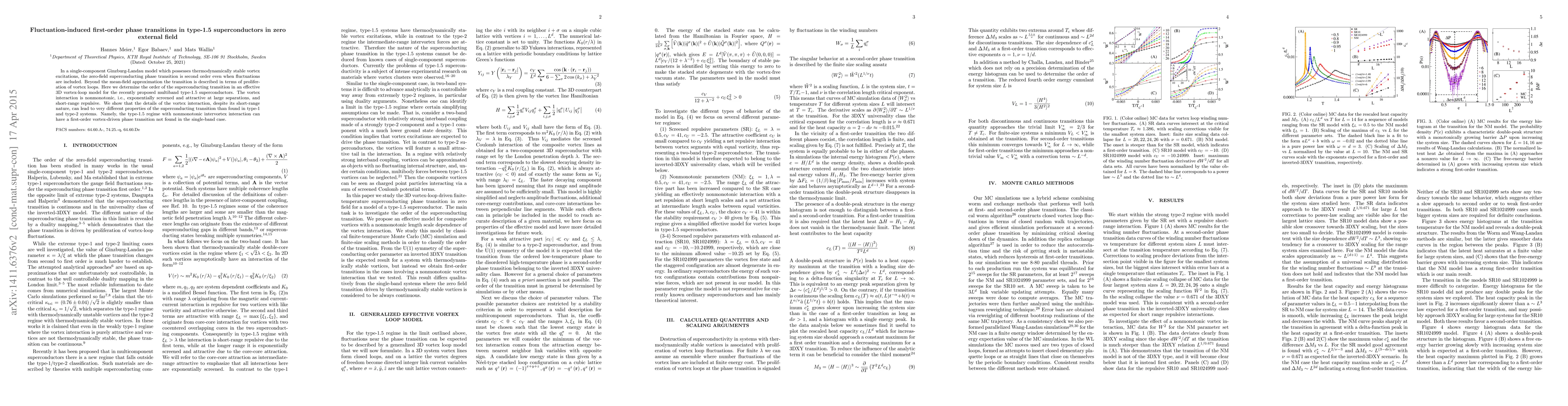 In a single-component Ginzburg-Landau model which possesses thermodynamically stable vortex excitations, the zero-field superconducting phase transition is second order even when fluctuations are included. Beyond the mean-field approximation the transition is described in terms of proliferation of vortex loops. Here we determine the order of the superconducting transition in an effective 3D vortex-loop model for the recently proposed multiband type-1.5 superconductors. The vortex interaction is nonmonotonic, i.e., exponentially screened and attractive at large separations, and short-range repulsive. We show that the details of the vortex interaction, despite its short-range nature, can lead to very different properties of the superconducting transition than found in type-1 and type-2 systems. Namely, the type-1.5 regime with nonmonotonic intervortex interaction can have a first-order vortex-driven phase transition not found in the single-band case.