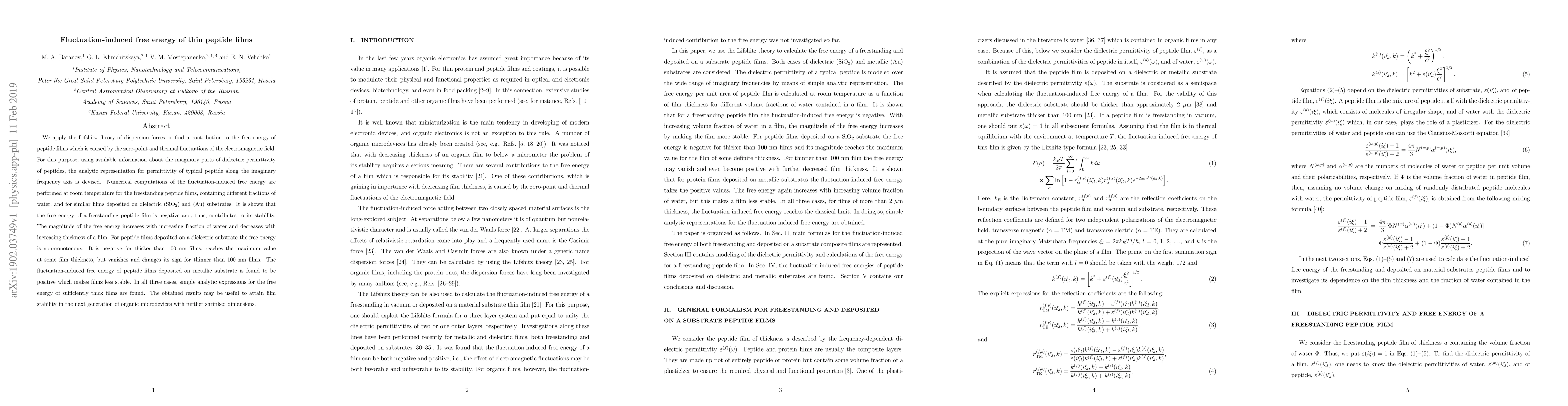We apply the Lifshitz theory of dispersion forces to find a contribution to the free energy of peptide films which is caused by the zero-point and thermal fluctuations of the electromagnetic field. For this purpose, using available information about the imaginary parts of dielectric permittivity of peptides, the analytic representation for permittivity of typical peptide along the imaginary frequency axis is devised. Numerical computations of the fluctuation-induced free energy are performed at room temperature for the freestanding peptide films, containing different fractions of water, and for similar films deposited on dielectric (SiO$_2$) and metal (Au) substrates. It is shown that the free energy of a freestanding peptide film is negative and, thus, contributes to its stability. The magnitude of the free energy increases with increasing fraction of water and decreases with increasing thickness of a film. For peptide films deposited on a dielectric substrate the free energy is nonmonotonous. It is negative for thicker than 100 nm films, reaches the maximum value at some film thickness, but vanishes and changes its sign for thinner than 100 nm films. The fluctuation-induced free energy of peptide films deposited on metallic substrate is found to be positive which makes films less stable. In all three cases, simple analytic expressions for the free energy of sufficiently thick films are found. The obtained results may be useful to attain film stability in the next generation of organic microdevices with further shrinked dimensions.