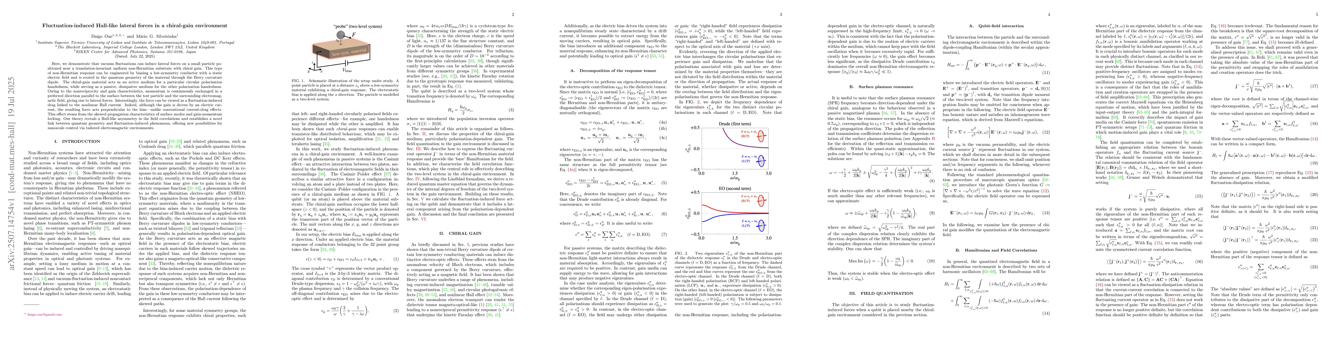 The research introduces a theoretical framework for understanding fluctuation-induced Hall-like lateral forces in chiral-gain environments.
