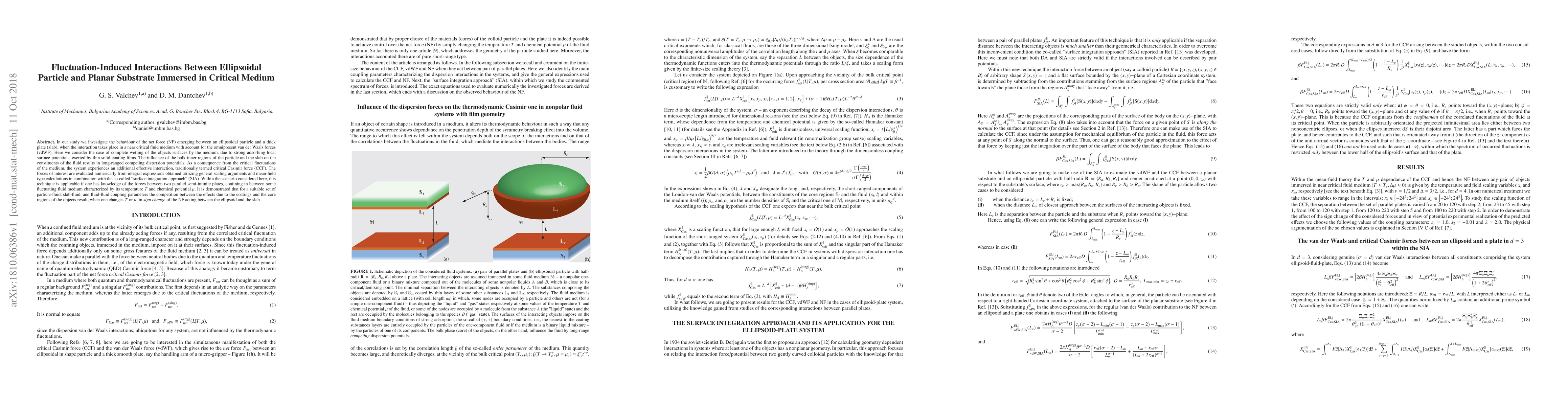 In our study we investigate the behaviour of the net force (NF) emerging between an ellipsoidal particle and a thick plate (slab), when the interaction takes place in a near critical fluid medium with account for the omnipresent van der Waals forces (vdWF). Here we consider the case of complete wetting of the objects surfaces by the medium, due to strong adsorbing local surface potentials, exerted by thin solid coating films. The influence of the bulk inner regions of the particle and the slab on the constituents of the fluid results in long-ranged competing dispersion potentials. As a consequence from the critical fluctuations of the medium, the system experiences an additional effective interaction, traditionally termed critical Casimir force (CCF). The forces of interest are evaluated numerically from integral expressions obtained utilizing general scaling arguments and mean-field type calculations in combination with the so-called "surface integration approach" (SIA). Within the scenario considered here, this technique is applicable if one has knowledge of the forces between two parallel semi-infinite plates, confining in between some fluctuating fluid medium characterized by its temperature $T$ and chemical potential $\mu$. It is demonstrated that for a suitable set of particle-fluid, slab-fluid, and fluid-fluid coupling parameters the competition between the effects due to the coatings and the core regions of the objects result, when one changes $T$ or $\mu$, in {\it sign change} of the NF acting between the ellipsoid and the slab.