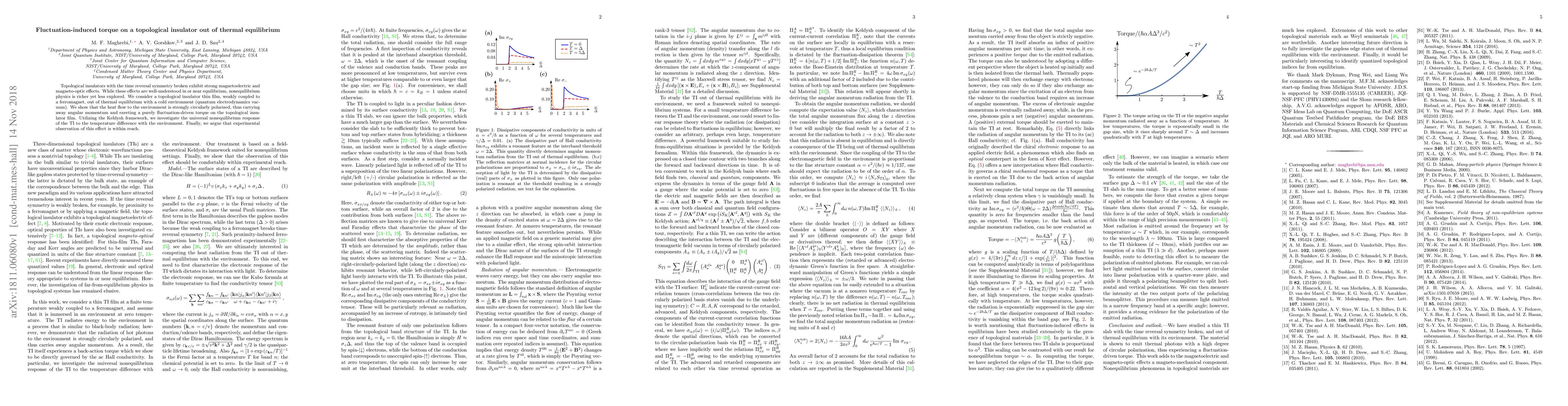This paper investigates the nonequilibrium physics of topological insulators, demonstrating that heat flow from a topological insulator thin film to a cold environment generates a strongly circularly polarized current, leading to a fluctuation-induced torque. The study employs the Keldysh framework to explore the universal response of the topological insulator under temperature differences.