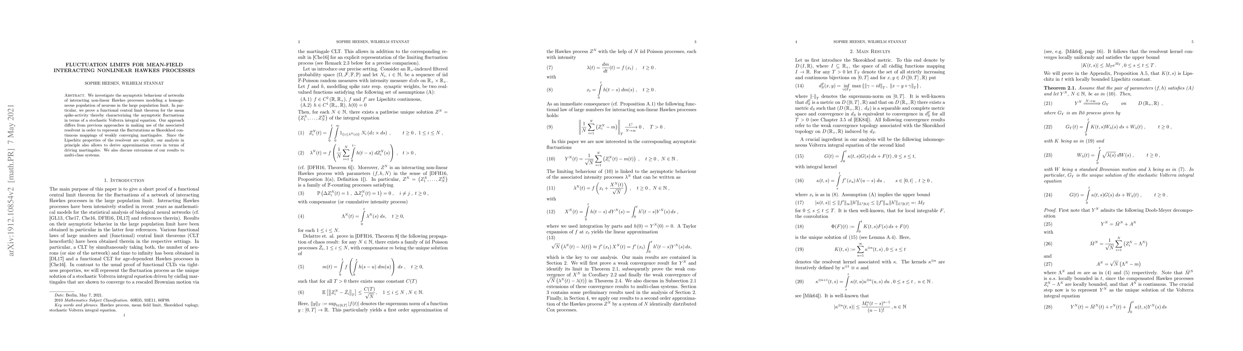 We investigate the asymptotic behaviour of networks of interacting non-linear Hawkes processes modeling a homogeneous population of neurons in the large population limit. In particular, we prove a functional central limit theorem for the mean spike-activity thereby characterizing the asymptotic fluctuations in terms of a stochastic Volterra integral equation. Our approach differs from previous approaches in making use of the associated resolvent in order to represent the fluctutations as Skorokhod continuous mappings of weakly converging martingales. Since the Lipschitz properties of the resolvent are explicit, our analysis in principle also allows to derive approximation errors in terms of driving martingales.