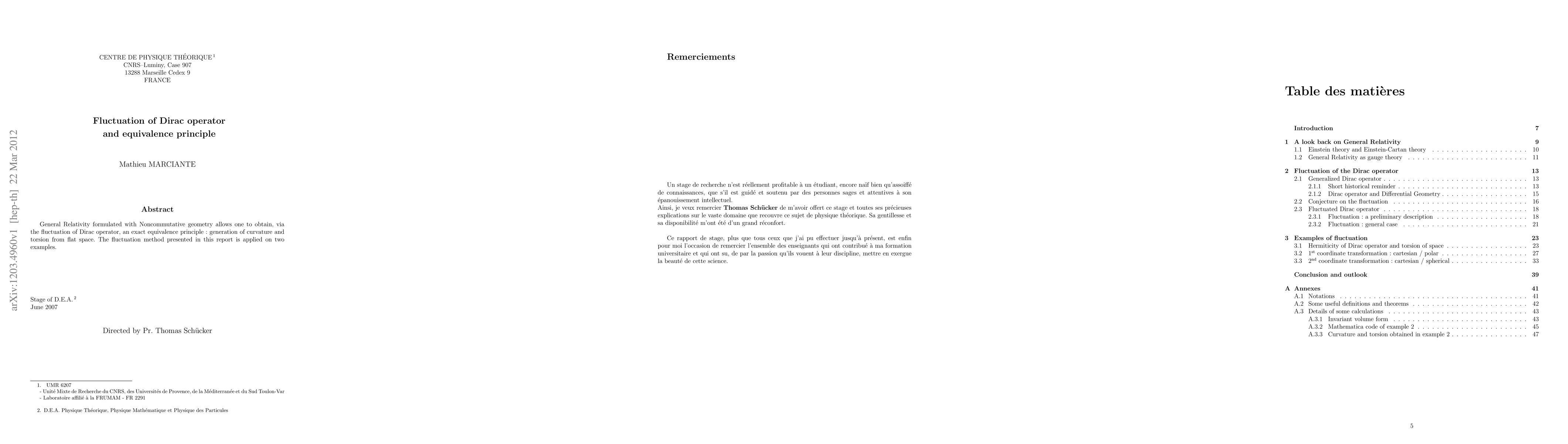 General Relativity formulated with Noncommutative geometry allows one to obtain, via the fluctuation of Dirac operator, an exact equivalence principle: generation of curvature and torsion from flat space. The fluctuation method presented in this report is applied on two examples.