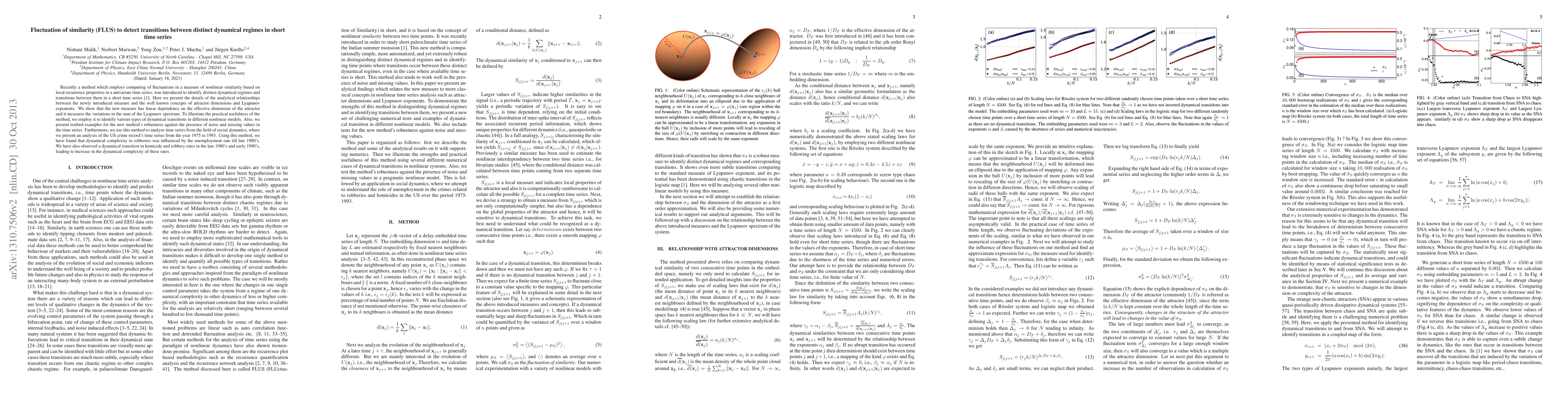 The Fluctuation of Similarity (FLUS) method identifies transitions between dynamical regimes in short time series by measuring fluctuations in nonlinear similarity based on local recurrence properties. It correlates with attractor dimensions and Lyapunov exponents, demonstrating robustness against noise and missing data, and successfully analyzes social dynamics, revealing significant shifts in crime rates linked to economic factors.