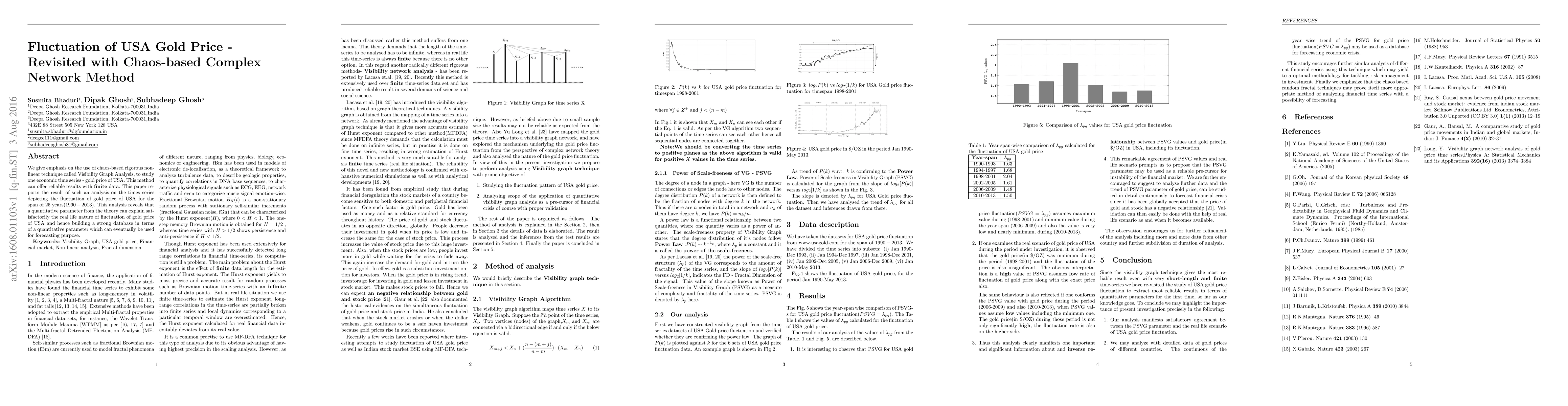 We give emphasis on the use of chaos-based rigorous nonlinear technique called Visibility Graph Analysis, to study one economic time series - gold price of USA. This method can offer reliable results with fiinite data. This paper reports the result of such an analysis on the times series depicting the fluctuation of gold price of USA for the span of 25 years(1990 - 2013). This analysis reveals that a quantitative parameter from the theory can explain satisfactorily the real life nature of fluctuation of gold price of USA and hence building a strong database in terms of a quantitative parameter which can eventually be used for forecasting purpose.