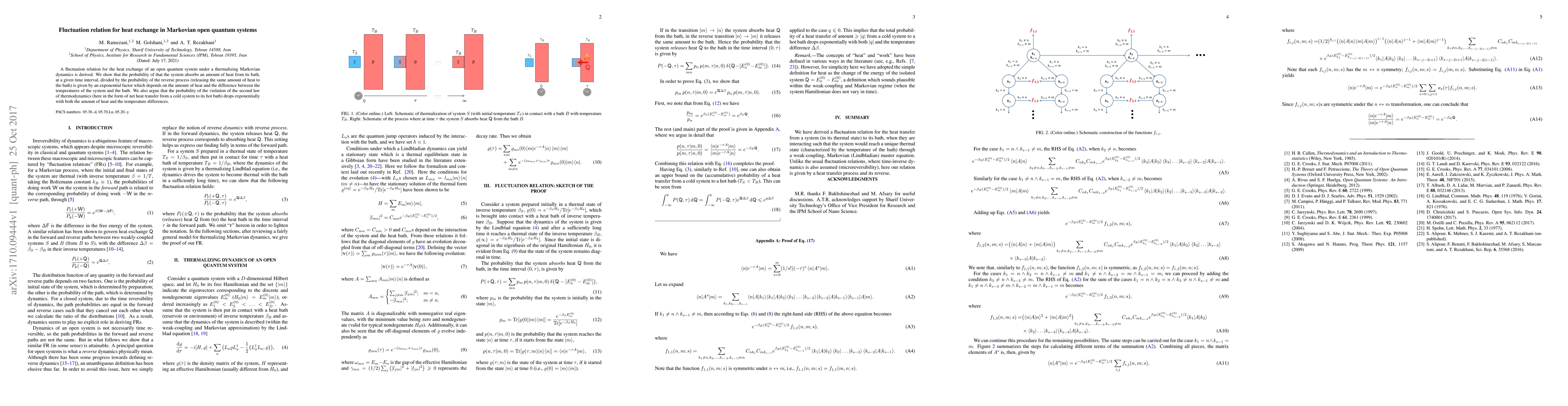 This paper derives a fluctuation relation for heat exchange in Markovian open quantum systems, showing that the ratio of probabilities for heat absorption versus release follows an exponential factor dependent on the heat amount and temperature difference. It also demonstrates that the likelihood of violating the second law of thermodynamics decreases exponentially with heat and temperature differences.