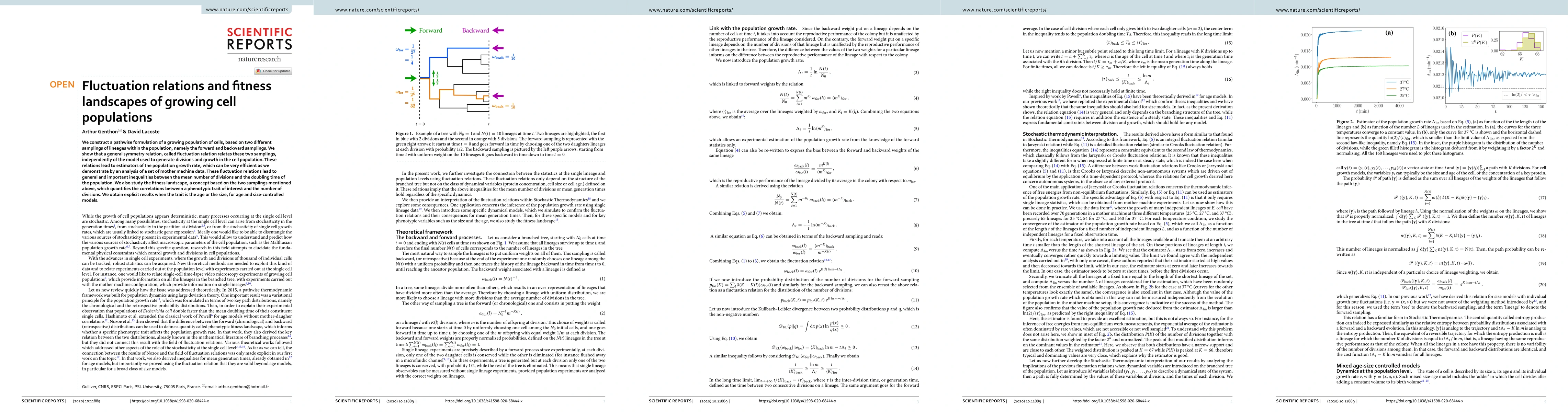 We construct a pathwise formulation of a growing population of cells, based on two different samplings of lineages within the population, namely the forward and backward samplings. We show that a general symmetry relation, called fluctuation relation relates these two samplings, independently of the model used to generate divisions and growth in the cell population. These relations lead to estimators of the population growth rate, which can be very efficient as we demonstrate by an analysis of a set of mother machine data. These fluctuation relations lead to general and important inequalities between the mean number of divisions and the doubling time of the population. We also study the fitness landscape, a concept based on the two samplings mentioned above, which quantifies the correlations between a phenotypic trait of interest and the number of divisions. We obtain explicit results when the trait is the age or the size, for age and size-controlled models.