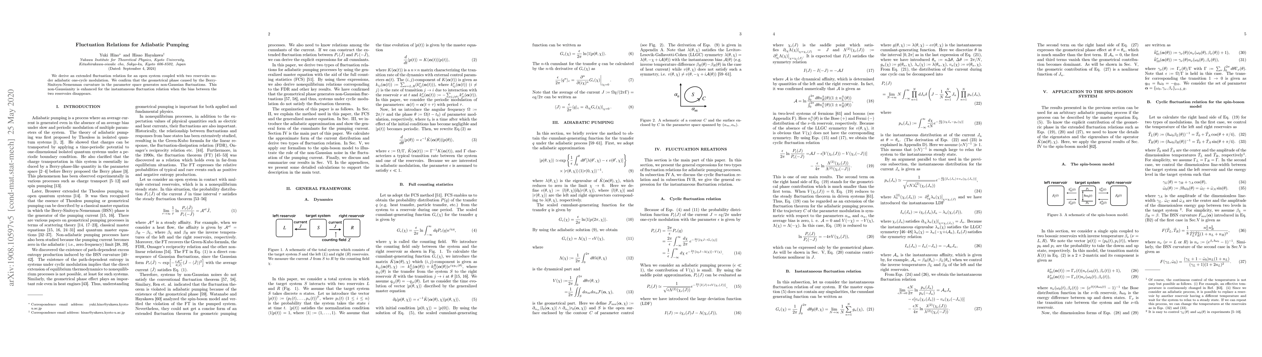 We derive an extended fluctuation relation for an open system coupled with two reservoirs under adiabatic one-cycle modulation. We confirm that the geometric phase caused by the Berry-Sintisyn-Nemenman curvature in the parameter space generates non-Gaussian fluctuations. This non-Gaussianity is enhanced for the instantaneous fluctuation relation when the bias between the two reservoirs disappears.