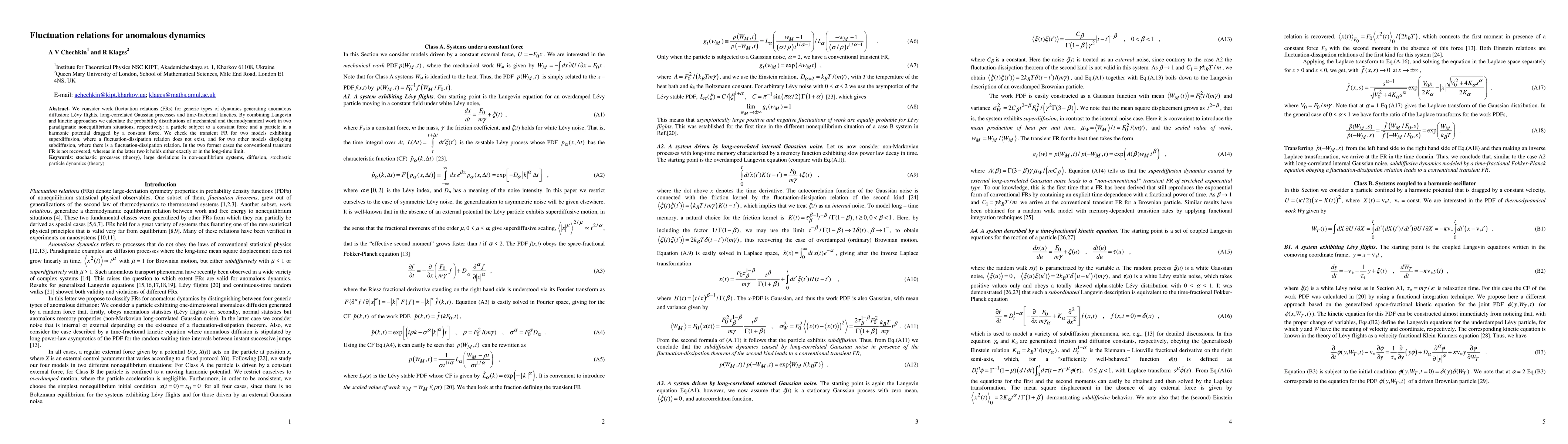 We consider work fluctuation relations (FRs) for generic types of dynamics generating anomalous diffusion: Levy flights, long-correlated Gaussian processes and time-fractional kinetics. By combining Langevin and kinetic approaches we calculate the probability distributions of mechanical and thermodynamical work in two paradigmatic nonequilibrium situations, respectively: a particle subject to a constant force and a particle in a harmonic potential dragged by a constant force. We check the transient FR for two models exhibiting superdiffusion, where a fluctuation-dissipation relation does not exist, and for two other models displaying subdiffusion, where there is a fluctuation-dissipation relation. In the two former cases the conventional transient FR is not recovered, whereas in the latter two it holds either exactly or in the long-time limit.