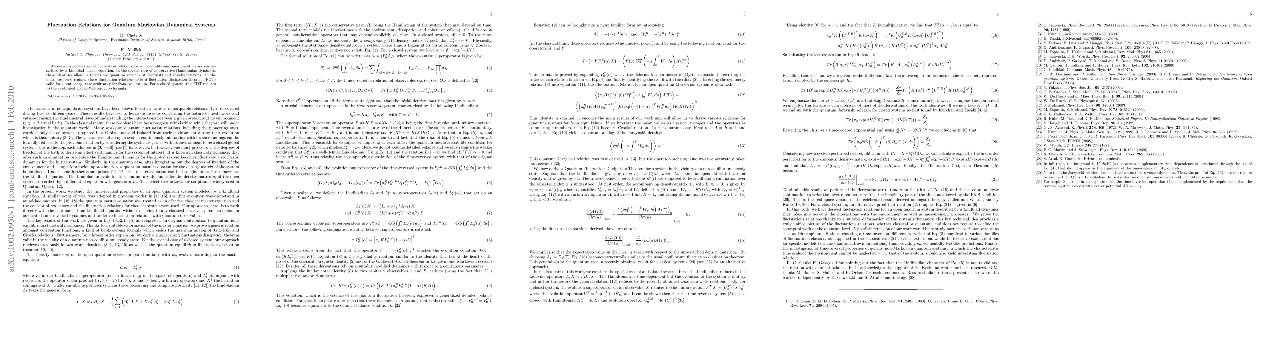 This paper derives fluctuation relations for nonequilibrium open quantum systems governed by a Lindblad master equation, establishing quantum versions of Jarzynski and Crooks relations and a generalized fluctuation-dissipation theorem valid for systems far from equilibrium.