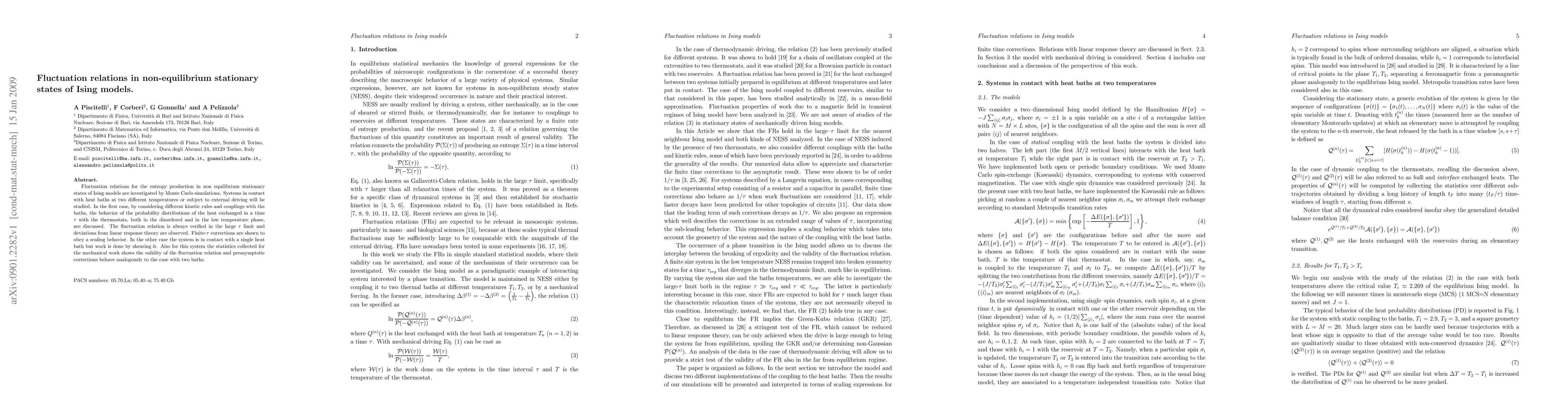 This paper investigates fluctuation relations for entropy production in non-equilibrium stationary states of Ising models using Monte Carlo simulations. It finds that the fluctuation relation holds in the large time limit, with deviations from linear response theory and scaling behavior in finite-time corrections.