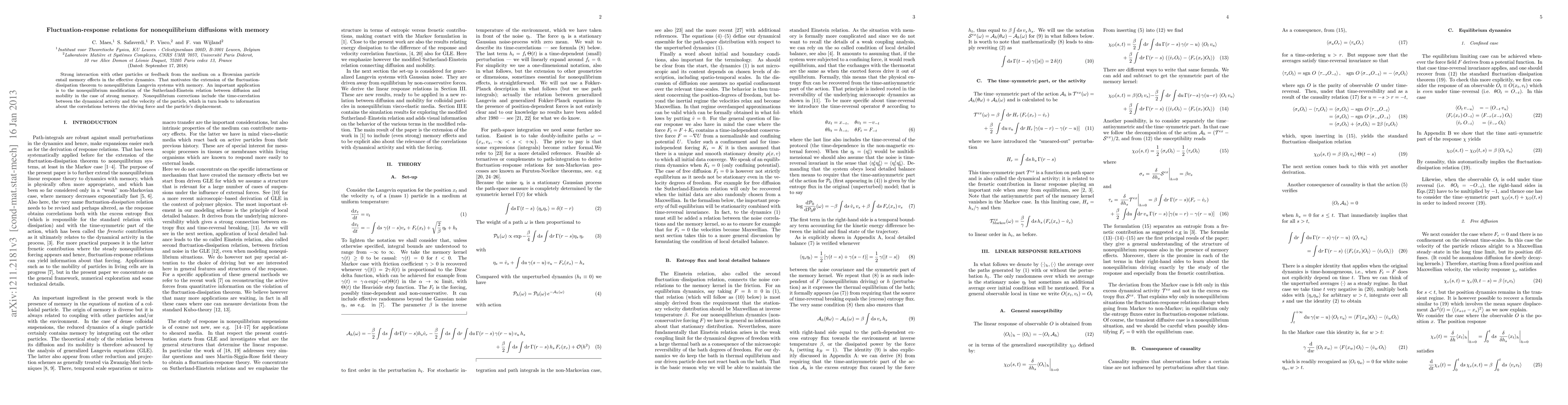 Strong interaction with other particles or feedback from the medium on a Brownian particle entail memory effects in the effective dynamics. We discuss the extension of the fluctuation-dissipation theorem to nonequilibrium Langevin systems with memory. An important application is to the extension of the Sutherland-Einstein relation between diffusion and mobility. Nonequilibrium corrections include the time-correlation between the dynamical activity and the velocity of the particle, which in turn leads to information about the correlations between the driving force and the particle's displacement.