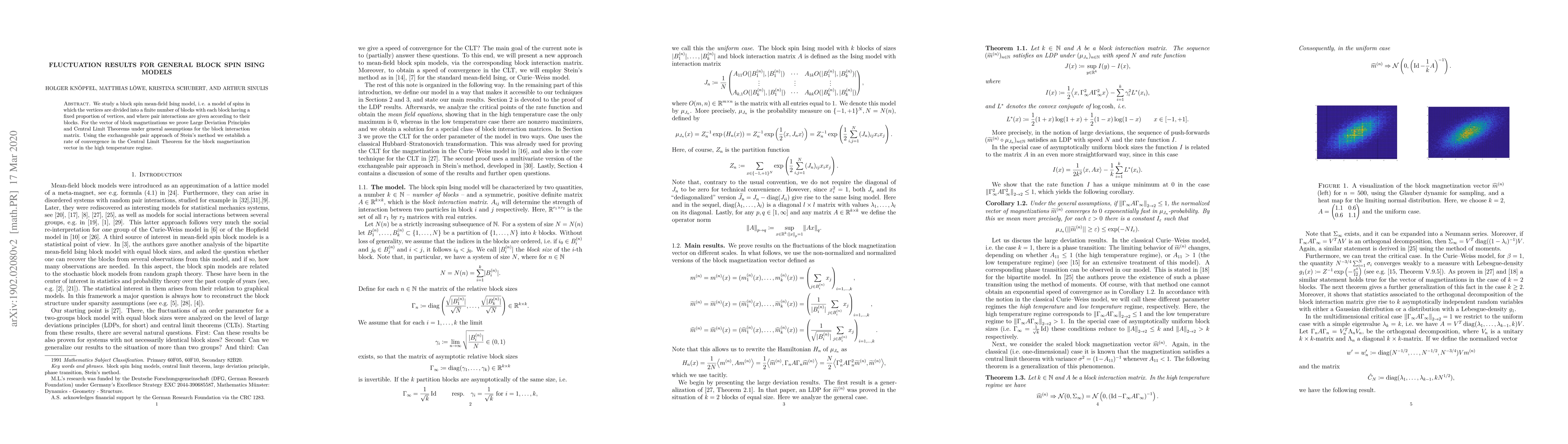 We study a block spin mean-field Ising model, i.e. a model of spins in which the vertices are divided into a finite number of blocks with each block having a fixed proportion of vertices, and where pair interactions are given according to their blocks. For the vector of block magnetizations we prove Large Deviation Principles and Central Limit Theorems under general assumptions for the block interaction matrix. Using the exchangeable pair approach of Stein's method we establish a rate of convergence in the Central Limit Theorem for the block magnetization vector in the high temperature regime.