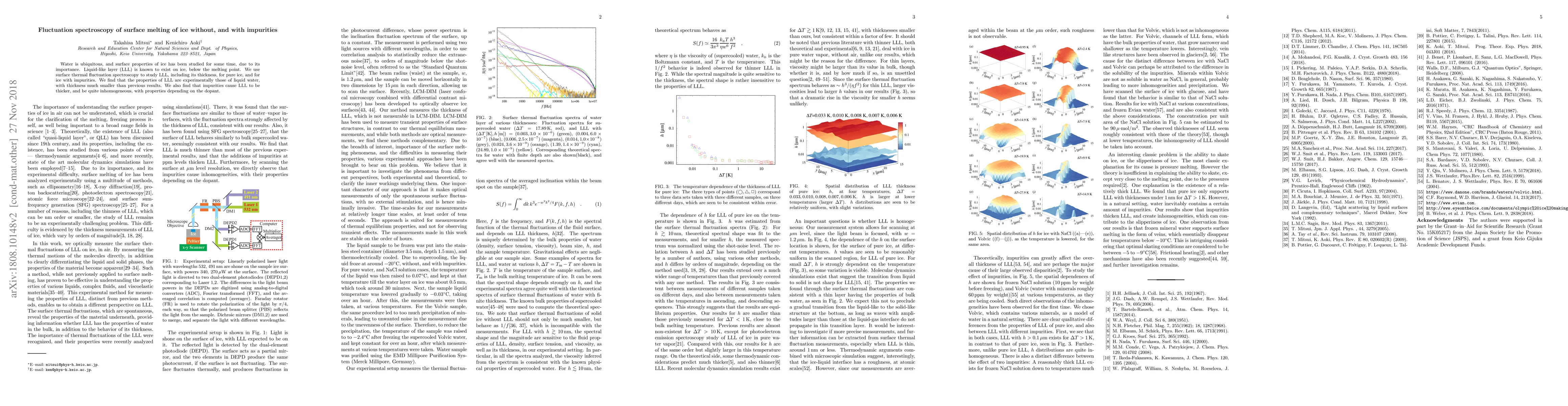Water, in its three phases, is ubiquitous, and the surface properties of ice is important to clarifying the process of melting, as well as to various other fields, including geophysics. As such, the subject has been studied both theoretically and experimentally, for over a hundred years, while being an active field of research today. It has been established that surface melting, or premelting, exists below the melting point, and a `liquid-like layer' (LLL) exists on the surface of ice. Here, we use the surface thermal fluctuation spectra to study the properties of LLL, including its thickness, for pure ice, and for ice with impurities. We find that the properties of LLL are consistent with those of bulk liquid water, and for layers thicker than 10\,nm, their properties are experimentally indistinguishable from those of liquid water. Measured thicknesses are found to be much smaller than the previous experimental measurements close to the bulk melting temperature. We find that the additions of impurities at ppm levels cause LLL to be thicker, as well to be quite inhomogeneous, with properties depending on the dopant. This is revealed by scanning the surface at $\mu$m level resolution, and can contribute to the slipperiness of ice in natural settings.