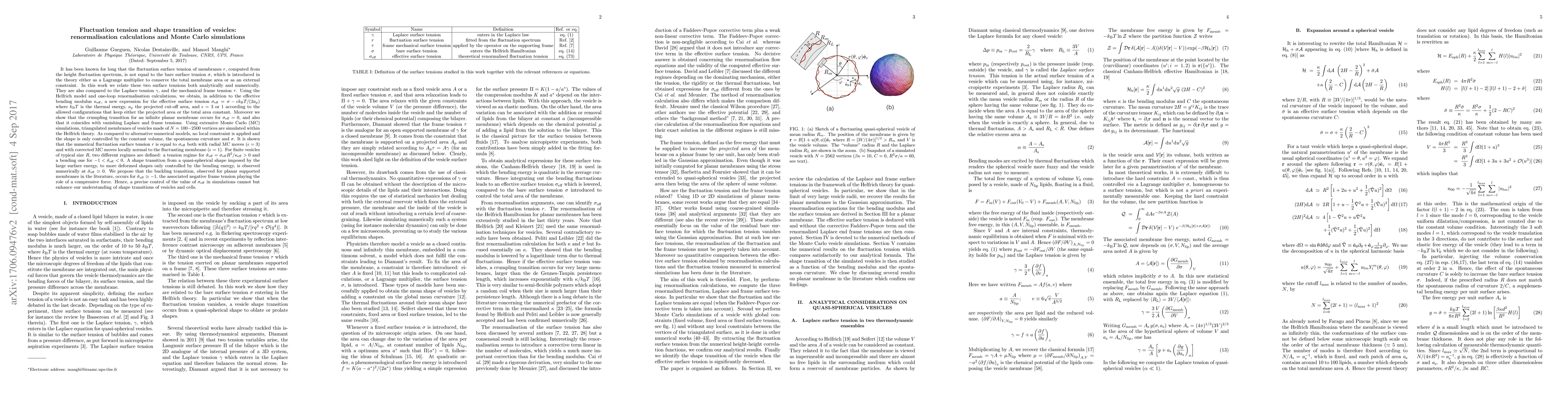It has been known for long that the fluctuation surface tension of membranes $r$, computed from the height fluctuation spectrum, is not equal to the bare surface tension $\sigma$ introduced in the Helfrich theory. In this work we relate these two surface tensions both analytically and numerically and compare them to the Laplace tension $\gamma$, and the mechanical frame tension $\tau$. Using one-loop renormalisation calculations, we obtain, in addition to the effective bending modulus $\kappa_{\rm eff}$, a new expression for the effective surface tension $\sigma_{\rm eff}=\sigma - \epsilon k_{\rm B}T/(2a_p)$ where $a_p$ the projected cut-off area, and $\epsilon=3$ or 1 according to the allowed configurations. Moreover we show that the crumpling transition for an infinite planar membrane occurs for $\sigma_{\rm eff}=0$, and also that it coincides with vanishing Laplace and frame tensions. Using extensive Monte Carlo (MC) simulations, triangulated membranes of vesicles made of $N=100-2500$ vertices are simulated. No local constraint is applied. It is shown that the numerical $r$ is equal to $\sigma_{\rm eff}$ both with radial MC moves ($\epsilon=3$) and with corrected MC moves locally normal to the fluctuating membrane ($\epsilon=1$). For finite vesicles of typical size $R$, two different regimes are defined: a tension regime for $\hat \sigma_{\rm eff}=\sigma_{\rm eff}R^2/\kappa_{\rm eff}>0$ and a bending one for $-1<\hat \sigma_{\rm eff}<0$. A shape transition from a quasi-spherical shape imposed by the large surface energy, to more deformed shapes only controlled by the bending energy, is observed numerically at $\hat \sigma_{\rm eff}\simeq 0$. We propose that the buckling transition, observed for planar supported membranes in the literature, occurs for $\hat \sigma_{\rm eff}\simeq-1$, the associated negative frame tension playing the role of a compressive force.