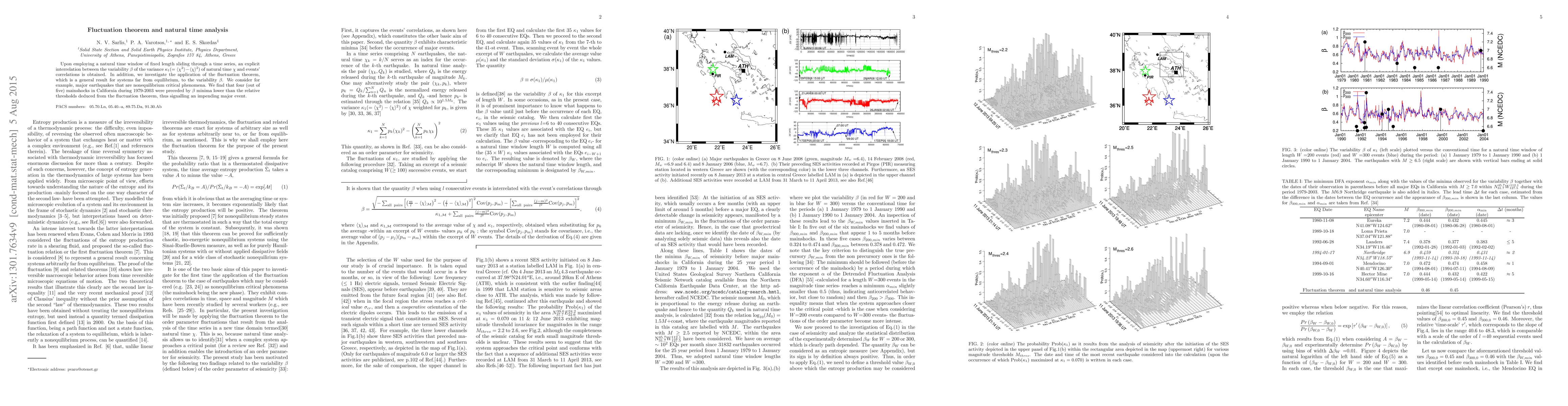 Upon employing a natural time window of fixed length sliding through a time series, an explicit interrelation between the variability $\beta$ of the variance $\kappa_1$($=< \chi^2 > - < \chi >^2$) of natural time $\chi$ and events' correlations is obtained. In addition, we investigate the application of the fluctuation theorem, which is a general result for systems far from equilibrium, to the variability $\beta$. We consider for example, major earthquakes that are nonequilibrium critical phenomena. We find that four (out of five) mainshocks in California during 1979-2003 were preceded by $\beta$ minima lower than the relative thresholds deduced from the fluctuation theorem, thus signalling an impending major event.