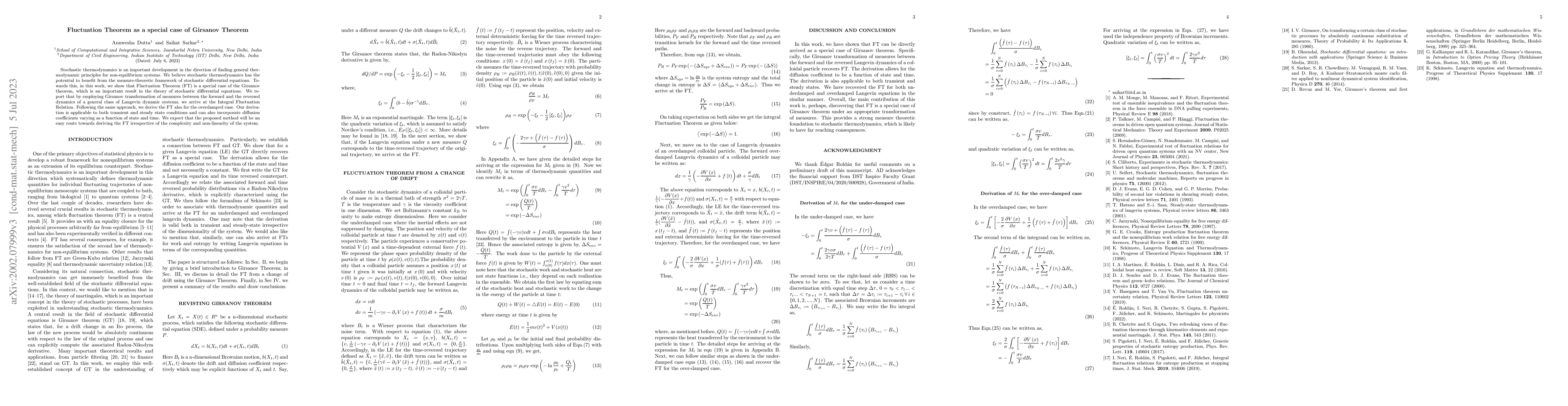 This paper demonstrates that the Fluctuation Theorem (FT) is a special case of the Girsanov theorem from stochastic differential equations. By applying Girsanov transformation, the authors derive the Integral Fluctuation Relation and the FT for both general and overdamped Langevin dynamics, applicable to various conditions and varying diffusion coefficients.