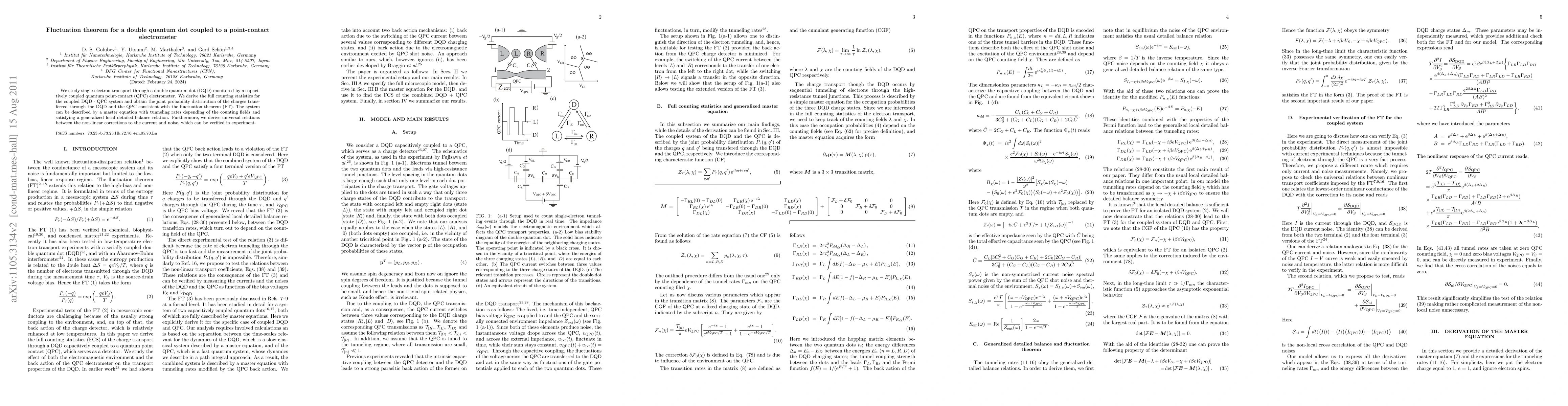 This paper investigates single-electron transport in a double quantum dot coupled to a quantum point-contact electrometer, deriving full counting statistics and the joint probability distribution of transferred charges. It establishes a fluctuation theorem for the system and provides universal relations for current and noise corrections, applicable for experimental verification.