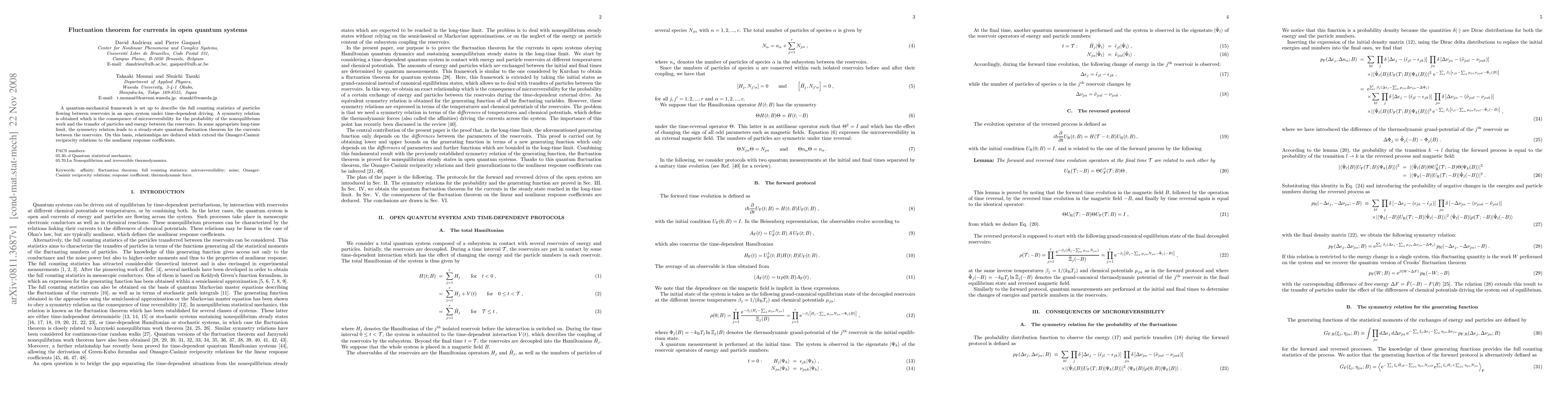 A quantum-mechanical framework is set up to describe the full counting statistics of particles flowing between reservoirs in an open system under time-dependent driving. A symmetry relation is obtained which is the consequence of microreversibility for the probability of the nonequilibrium work and the transfer of particles and energy between the reservoirs. In some appropriate long-time limit, the symmetry relation leads to a steady-state quantum fluctuation theorem for the currents between the reservoirs. On this basis, relationships are deduced which extend the Onsager-Casimir reciprocity relations to the nonlinear response coefficients.