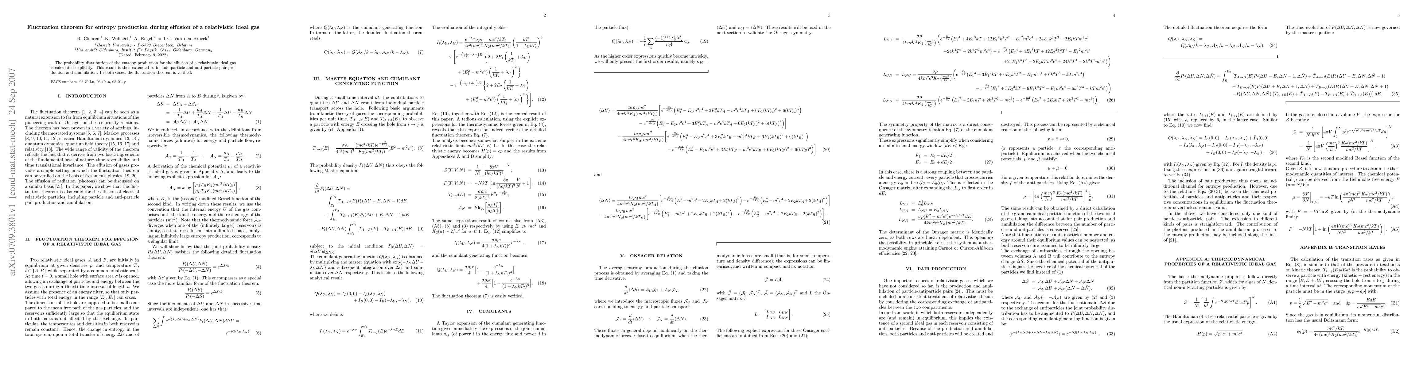 The paper calculates the probability distribution of entropy production during the effusion of a relativistic ideal gas, extending the analysis to include particle-antiparticle interactions. The fluctuation theorem is verified in both scenarios.