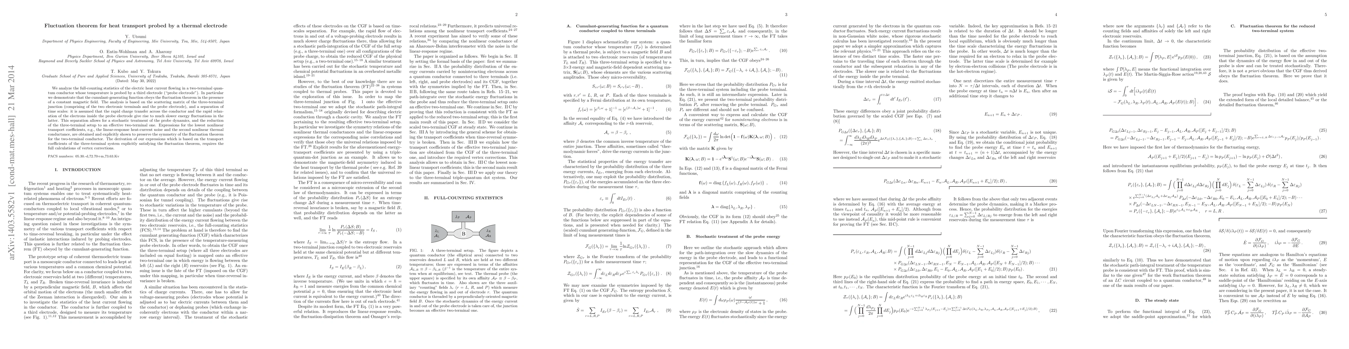 We analyze the full-counting statistics of the electric heat current flowing in a two-terminal quantum conductor whose temperature is probed by a third electrode ("probe electrode"). In particular we demonstrate that the cumulant-generating function obeys the fluctuation theorem in the presence of a constant magnetic field. The analysis is based on the scattering matrix of the three-terminal junction (comprising of the two electronic terminals and the probe electrode), and a separation of time scales: it is assumed that the rapid charge transfer across the conductor and the rapid relaxation of the electrons inside the probe electrode give rise to much slower energy fluctuations in the latter. This separation allows for a stochastic treatment of the probe dynamics, and the reduction of the three-terminal setup to an effective two-terminal one. Expressions for the lowest nonlinear transport coefficients, e.g., the linear-response heat-current noise and the second nonlinear thermal conductance, are obtained and explicitly shown to preserve the symmetry of the fluctuation theorem for the two-terminal conductor. The derivation of our expressions which is based on the transport coefficients of the three-terminal system explicitly satisfying the fluctuation theorem, requires the full calculations of vertex corrections.