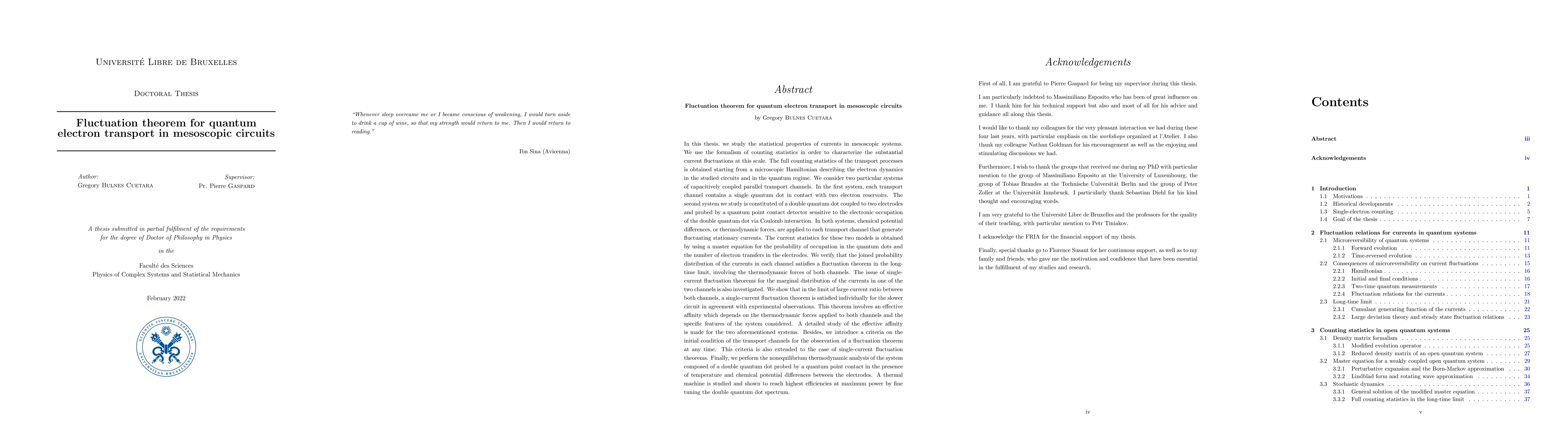 This paper investigates the statistical properties of currents in mesoscopic quantum circuits, specifically in systems with capacitively coupled transport channels. It verifies a fluctuation theorem for the joint probability distribution of currents in these channels and explores single-current fluctuation theorems under large current ratios. The study also introduces criteria for observing fluctuation theorems under various initial conditions and analyzes the efficiency of thermal machines in double quantum dot systems.