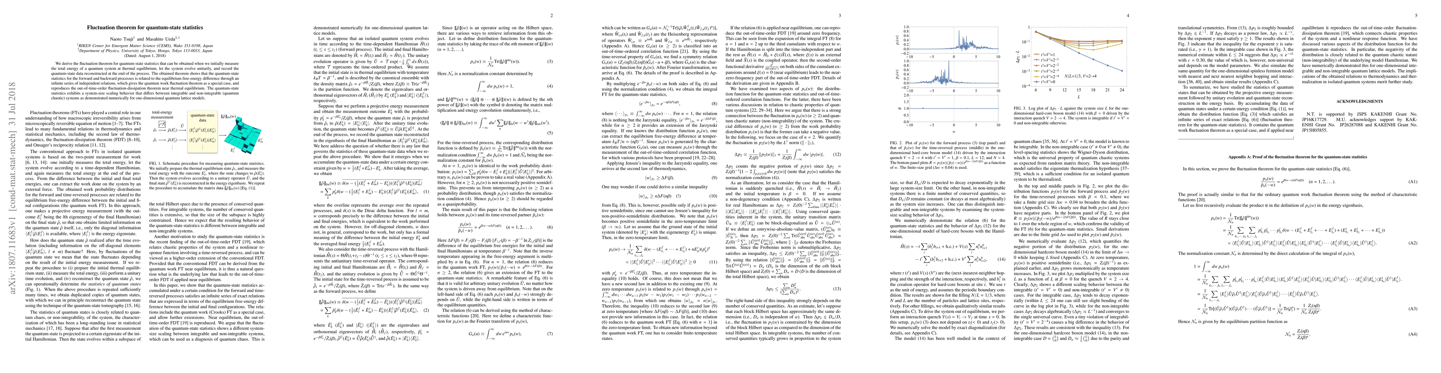 The paper derives a fluctuation theorem for quantum-state statistics, showing a relation between forward and backward processes in quantum systems and the equilibrium free-energy difference, with implications for quantum work and out-of-time-order fluctuation-dissipation theorems. Numerical results demonstrate different scaling behaviors in integrable versus non-integrable quantum systems.