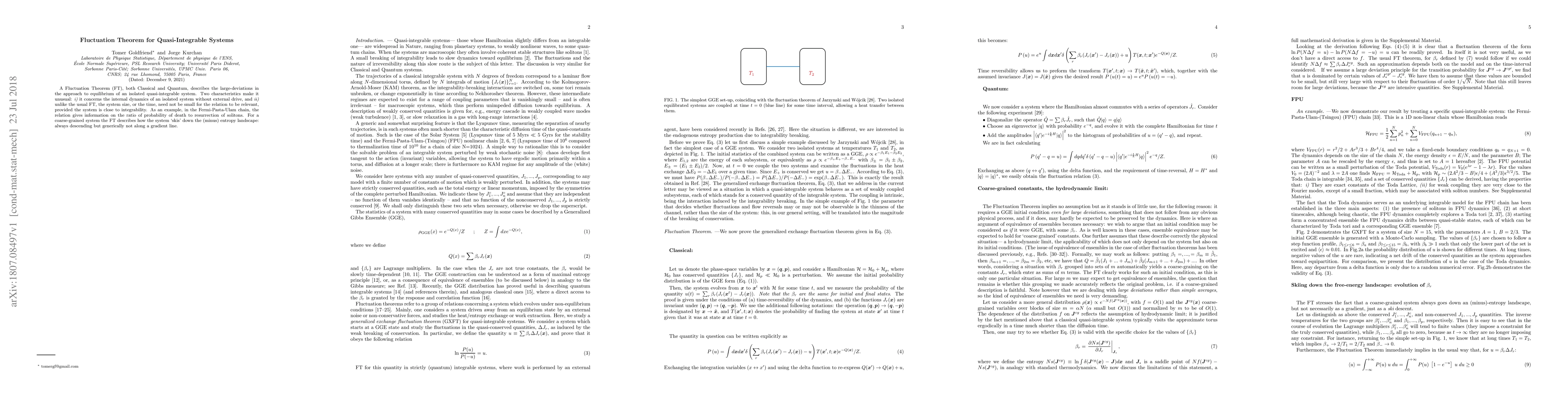 A Fluctuation Theorem (FT), both Classical and Quantum, describes the large-deviations in the approach to equilibrium of an isolated quasi-integrable system. Two characteristics make it unusual: (i) it concerns the internal dynamics of an isolated system without external drive, and (ii) unlike the usual FT, the system size, or the time, need not be small for the relation to be relevant, provided the system is close to integrability. As an example, in the Fermi-Pasta-Ulam chain, the relation gives information on the ratio of probability of death to resurrection of solitons. For a coarse-grained system the FT describes how the system `skis' down the (minus) entropy landscape: always descending but generically not along a gradient line.