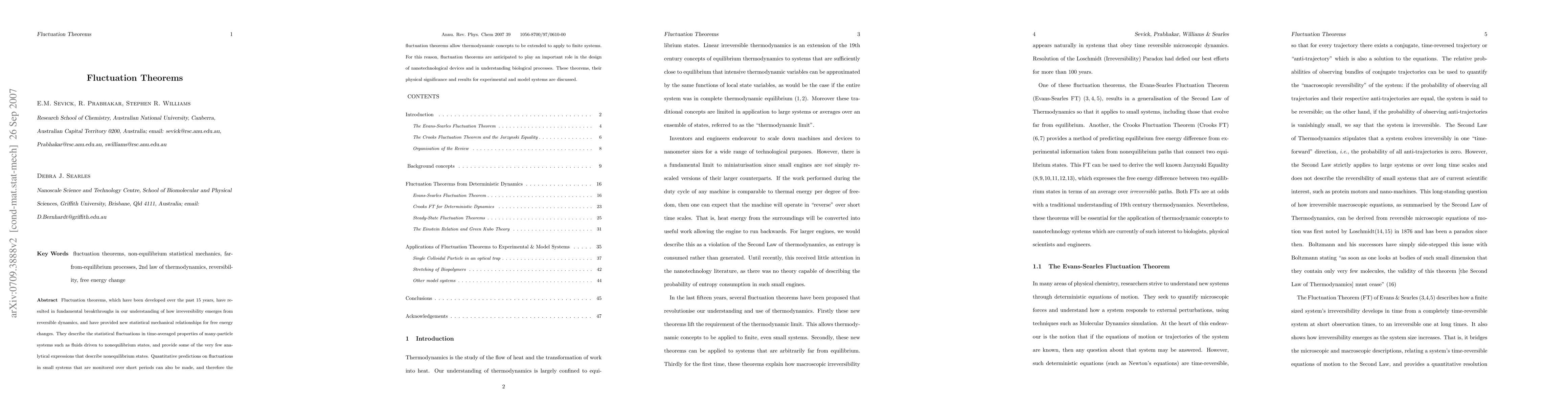 Fluctuation theorems, which have been developed over the past 15 years, have resulted in fundamental breakthroughs in our understanding of how irreversibility emerges from reversible dynamics, and have provided new statistical mechanical relationships for free energy changes. They describe the statistical fluctuations in time-averaged properties of many-particle systems such as fluids driven to nonequilibrium states, and provide some of the very few analytical expressions that describe nonequilibrium states. Quantitative predictions on fluctuations in small systems that are monitored over short periods can also be made, and therefore the fluctuation theorems allow thermodynamic concepts to be extended to apply to finite systems. For this reason, fluctuation theorems are anticipated to play an important role in the design of nanotechnological devices and in understanding biological processes. These theorems, their physical significance and results for experimental and model systems are discussed.