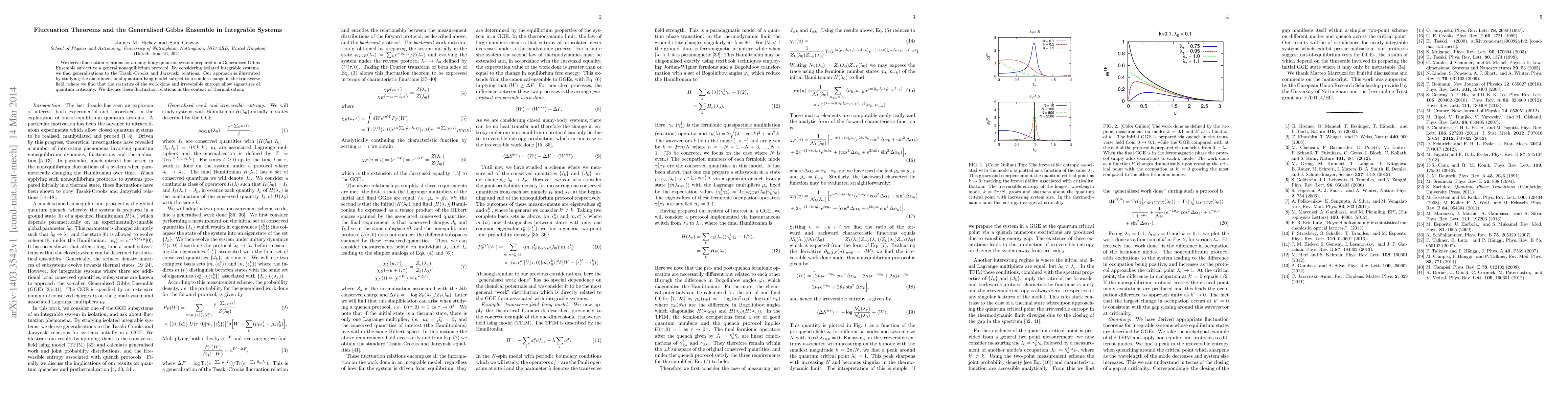 The paper presents a detailed derivation of fluctuation theorems for integrable systems in a GGE, extending known results for thermal ensembles and demonstrating their connection to quantum criticality.