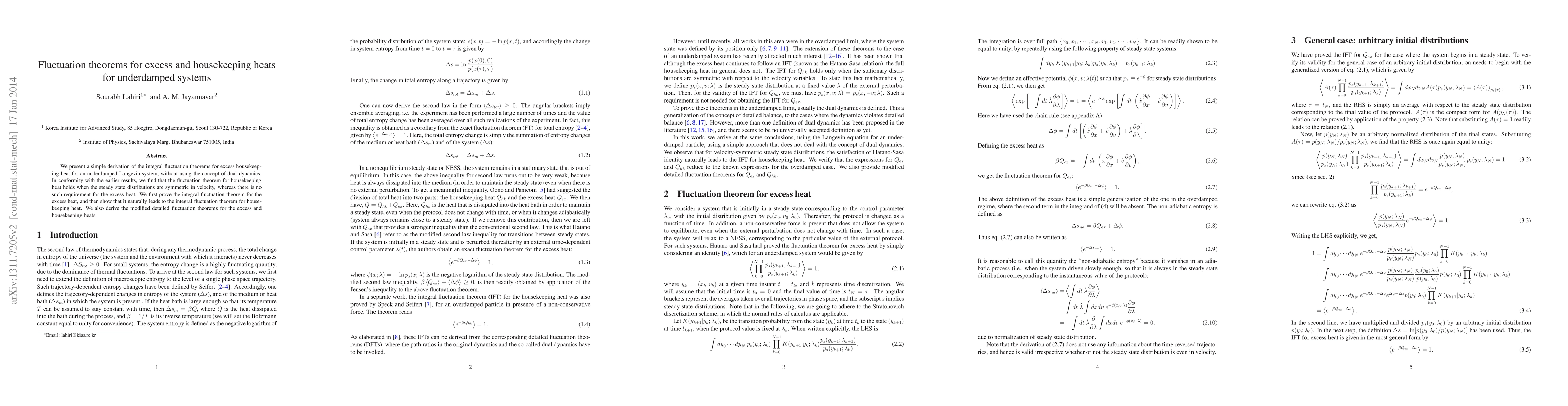 We present a simple derivation of the integral fluctuation theorems for excess housekeeping heat for an underdamped Langevin system, without using the concept of dual dynamics. In conformity with the earlier results, we find that the fluctuation theorem for housekeeping heat holds when the steady state distributions are symmetric in velocity, whereas there is no such requirement for the excess heat. We first prove the integral fluctuation theorem for the excess heat, and then show that it naturally leads to the integral fluctuation theorem for housekeeping heat. We also derive the modified detailed fluctuation theorems for the excess and housekeeping heats.