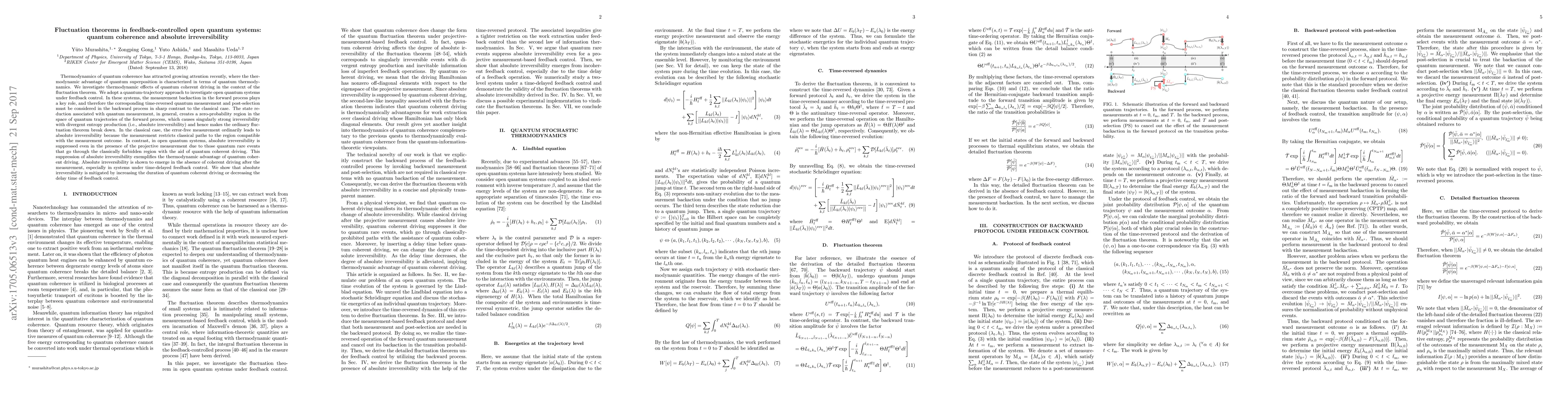 Thermodynamics of quantum coherence has attracted growing attention recently, where the thermodynamic advantage of quantum superposition is characterized in terms of quantum thermodynamics. We investigate thermodynamic effects of quantum coherent driving in the context of the fluctuation theorem. We adopt a quantum-trajectory approach to investigate open quantum systems under feedback control. In these systems, the measurement backaction in the forward process plays a key role, and therefore the corresponding time-reversed quantum measurement and post-selection must be considered in the backward process in sharp contrast to the classical case. The state reduction associated with quantum measurement, in general, creates a zero-probability region in the space of quantum trajectories of the forward process, which causes singularly strong irreversibility with divergent entropy production (i.e., absolute irreversibility) and hence makes the ordinary fluctuation theorem break down. In the classical case, the error-free measurement ordinarily leads to absolute irreversibility because the measurement restricts classical paths to the region compatible with the measurement outcome. In contrast, in open quantum systems, absolute irreversibility is suppressed even in the presence of the projective measurement due to those quantum rare events that go through the classically forbidden region with the aid of quantum coherent driving. This suppression of absolute irreversibility exemplifies the thermodynamic advantage of quantum coherent driving. Absolute irreversibility is shown to emerge in the absence of coherent driving after the measurement, especially in systems under time-delayed feedback control. We show that absolute irreversibility is mitigated by increasing the duration of quantum coherent driving or decreasing the delay time of feedback control.