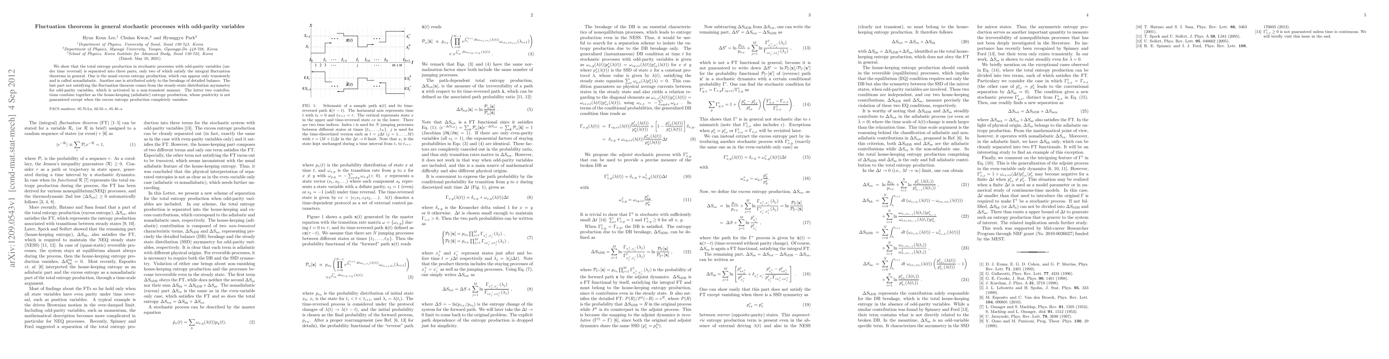 This paper demonstrates that entropy production in stochastic processes with odd-parity variables splits into three parts: transient nonadiabatic excess entropy, steady-state breakage of detailed balance, and a non-transient steady-state distribution asymmetry. Only the nonadiabatic excess entropy adheres to integral fluctuation theorems.