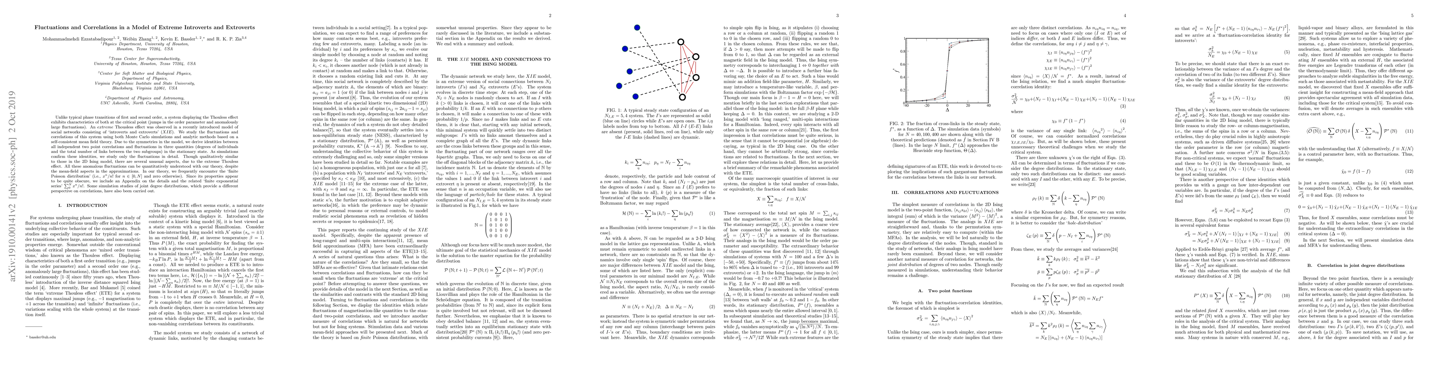 Unlike typical phase transitions of first and second order, a system displaying the Thouless effect exhibits characteristics of both at the critical point (jumps in the order parameter and anomalously large fluctuations). An $extreme$ Thousless effect was observed in a recently introduced model of social networks consisting of `introverts and extroverts' ($XIE$). We study the fluctuations and correlations of this system using both Monte Carlo simulations and analytic methods based on a self-consistent mean field theory. Due to the symmetries in the model, we derive identities between all independent two point correlations and fluctuations in three quantities (degrees of individuals and the total number of links between the two subgroups) in the stationary state. As simulations confirm these identities, we study only the fluctuations in detail. Though qualitatively similar to those in the 2D Ising model, there are several unusual aspects, due to the extreme Thouless effect. All these anomalous fluctuations can be quantitatively understood with our theory, despite the mean-field aspects in the approximations. In our theory, we frequently encounter the `finite Poisson distribution' (i.e., $x^{n}/n!$ for $n\in \left[ 0,N\right] $ and zero otherwise). Since its properties appear to be quite obscure, we include an Appendix on the details and the related `finite exponential series' $\sum_{0}^{N}x^{n}/n!$. Some simulation studies of joint degree distributions, which provide a different perspective on correlations, have also been carried out.