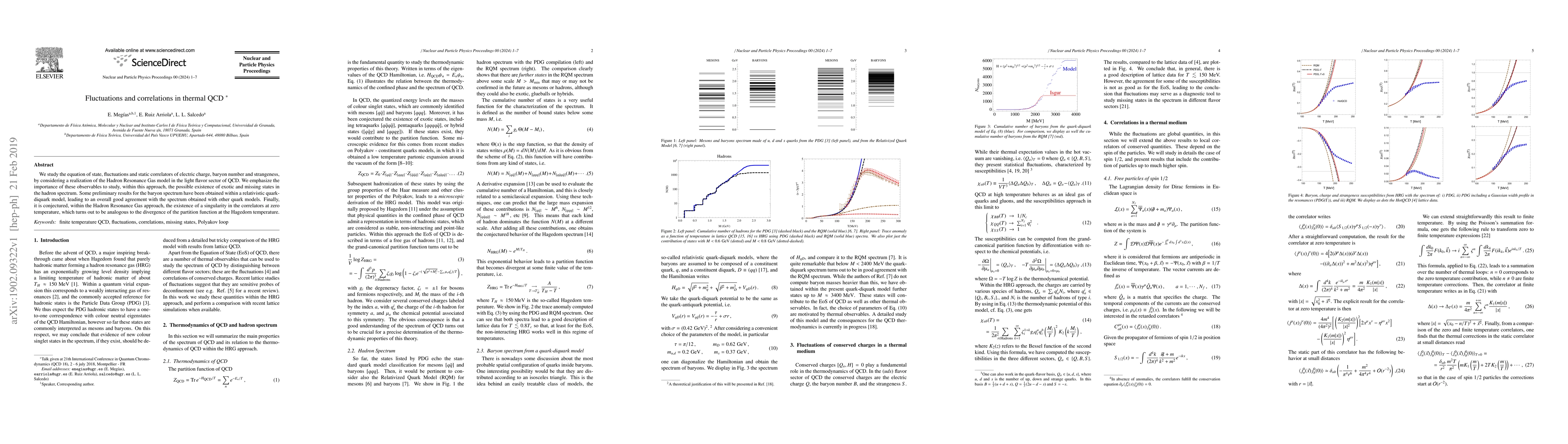 We study the equation of state, fluctuations and static correlators of electric charge, baryon number and strangeness, by considering a realization of the Hadron Resonance Gas model in the light flavor sector of QCD. We emphasize the importance of these observables to study, within this approach, the possible existence of exotic and missing states in the hadron spectrum. Some preliminary results for the baryon spectrum have been obtained within a relativistic quark-diquark model, leading to an overall good agreement with the spectrum obtained with other quark models. Finally, it is conjectured, within the Hadron Resonance Gas approach, the existence of a singularity in the correlators at zero temperature, which turns out to be analogous to the divergence of the partition function at the Hagedorn temperature.