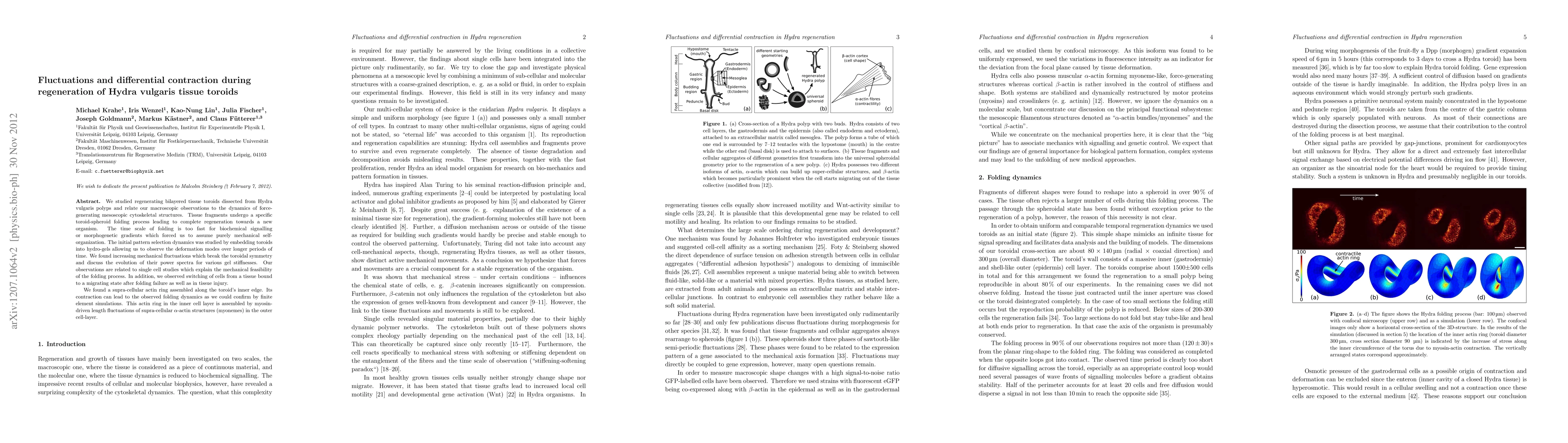 We studied regenerating bilayered tissue toroids dissected from Hydra vulgaris polyps and relate our macroscopic observations to the dynamics of force-generating mesoscopic cytoskeletal structures. Tissue fragments undergo a specific toroid-spheroid folding process leading to complete regeneration towards a new organism. The time scale of folding is too fast for biochemical signalling or morphogenetic gradients which forced us to assume purely mechanical self-organization. The initial pattern selection dynamics was studied by embedding toroids into hydro-gels allowing us to observe the deformation modes over longer periods of time. We found increasing mechanical fluctuations which break the toroidal symmetry and discuss the evolution of their power spectra for various gel stiffnesses. Our observations are related to single cell studies which explain the mechanical feasibility of the folding process. In addition, we observed switching of cells from a tissue bound to a migrating state after folding failure as well as in tissue injury. We found a supra-cellular actin ring assembled along the toroid's inner edge. Its contraction can lead to the observed folding dynamics as we could confirm by finite element simulations. This actin ring in the inner cell layer is assembled by myosin- driven length fluctuations of supra-cellular {\alpha}-actin structures (myonemes) in the outer cell-layer.