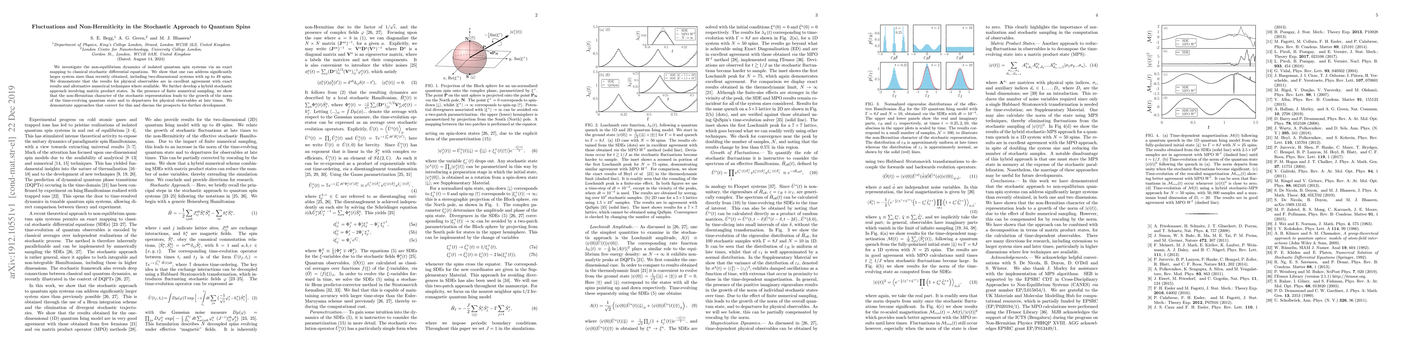 We investigate the non-equilibrium dynamics of isolated quantum spin systems via an exact mapping to classical stochastic differential equations. We show that one can address significantly larger system sizes than recently obtained, including two-dimensional systems with up to 49 spins. We demonstrate that the results for physical observables are in excellent agreement with exact results and alternative numerical techniques where available. We further develop a hybrid stochastic approach involving matrix product states. In the presence of finite numerical sampling, we show that the non-Hermitian character of the stochastic representation leads to the growth of the norm of the time-evolving quantum state and to departures for physical observables at late times. We demonstrate approaches that correct for this and discuss the prospects for further development.