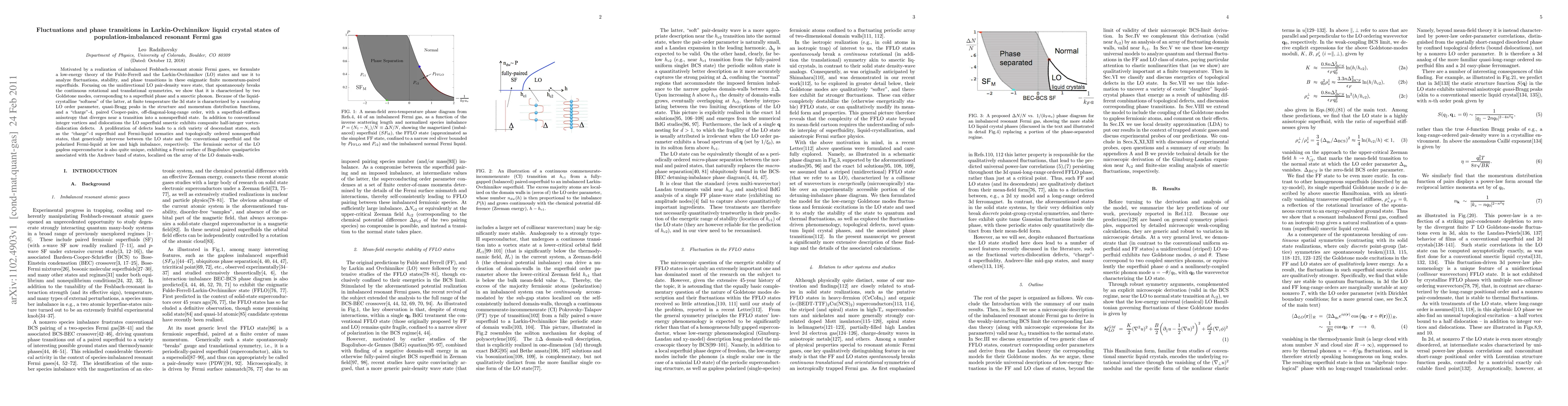 This paper investigates fluctuations, stability, and phase transitions in population-imbalanced Fermi gases in Larkin-Ovchinnikov (LO) states, revealing unique superfluid properties and defect structures, including composite half-integer vortex-dislocation defects and a rich variety of descendant states. The LO superfluid smectic exhibits anisotropic superfluid stiffness and a unique Fermi surface of Bogoliubov quasiparticles.