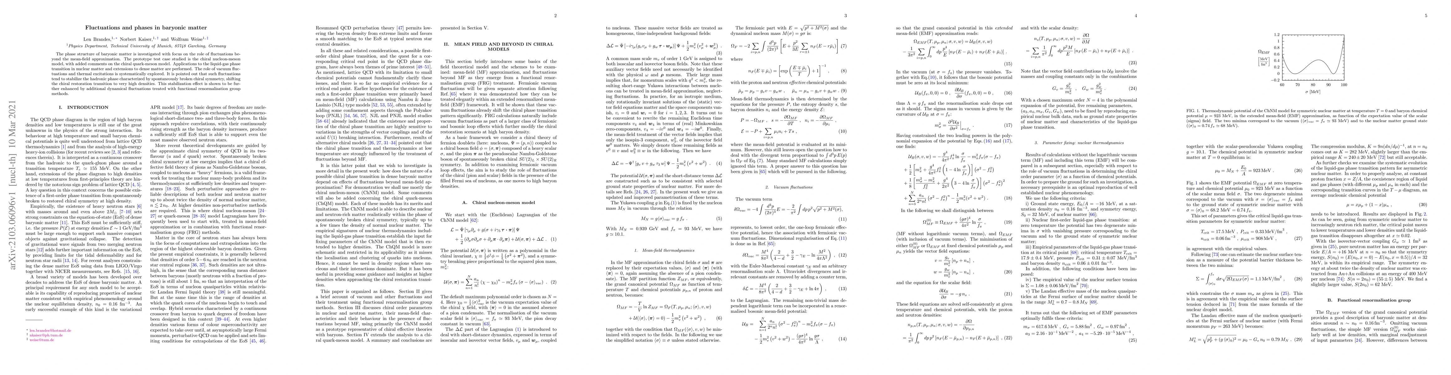 The phase structure of baryonic matter is investigated with focus on the role of fluctuations beyond the mean-field approximation. The prototype test case studied is the chiral nucleon-meson model, with added comments on the chiral quark-meson model. Applications to the liquid-gas phase transition in nuclear matter and extensions to dense matter are performed. The role of vacuum fluctuations and thermal excitations is systematically explored. It is pointed out that such fluctuations tend to stabilise the hadronic phase characterised by spontaneously broken chiral symmetry, shifting the chiral restoration transition to very high densities. This stabilisation effect is shown to be further enhanced by additional dynamical fluctuations treated with functional renormalisation group methods.