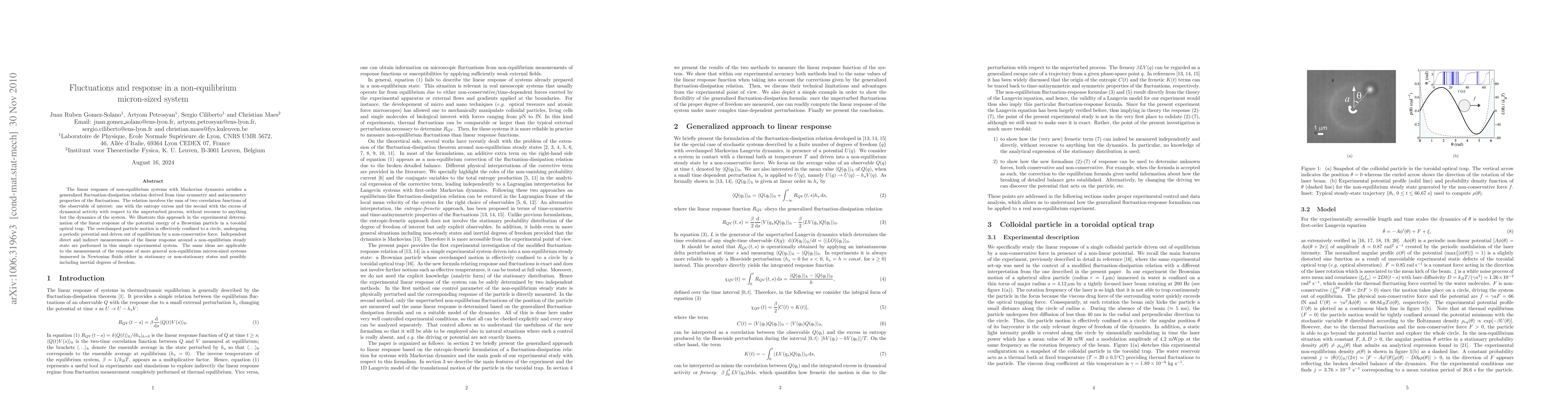 The linear response of non-equilibrium systems with Markovian dynamics satisfies a generalized fluctuation-dissipation relation derived from time symmetry and antisymmetry properties of the fluctuations. The relation involves the sum of two correlation functions of the observable of interest: one with the entropy excess and the second with the excess of dynamical activity with respect to the unperturbed process, without recourse to anything but the dynamics of the system. We illustrate this approach in the experimental determination of the linear response of the potential energy of a Brownian particle in a toroidal optical trap. The overdamped particle motion is effectively confined to a circle, undergoing a periodic potential and driven out of equilibrium by a non-conservative force. Independent direct and indirect measurements of the linear response around a non-equilibrium steady state are performed in this simple experimental system. The same ideas are applicable to the measurement of the response of more general non-equilibrium micron-sized systems immersed in Newtonian fluids either in stationary or non-stationary states and possibly including inertial degrees of freedom.