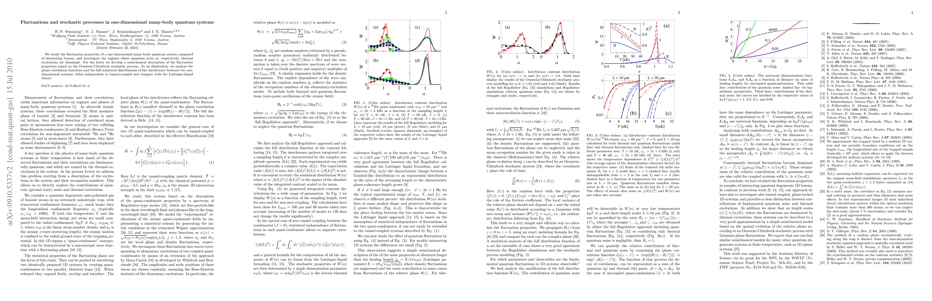 We study the fluctuation properties of a one-dimensional many-body quantum system composed of interacting bosons, and investigate the regimes where quantum noise or, respectively, thermal excitations are dominant. For the latter we develop a semiclassical description of the fluctuation properties based on the Ornstein-Uhlenbeck stochastic process. As an illustration, we analyze the phase correlation functions and the full statistical distributions of the interference between two one-dimensional systems, either independent or tunnel-coupled and compare with the Luttinger-liquid theory.