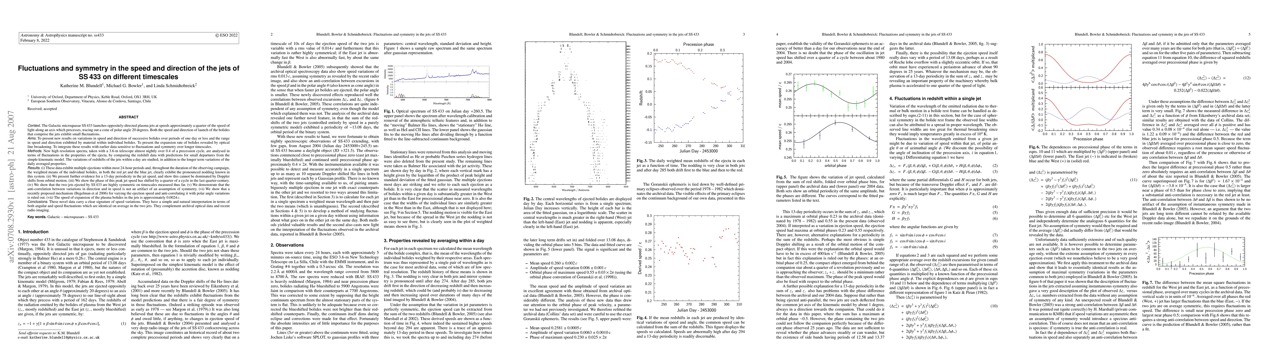 ABRIDGED We present new results on the variations in speed and direction of the jet bolides in the Galactic microquasar SS433, from high resolution spectra, taken with the ESO 3.6-m New Technology Telescope almost nightly over 0.4 of a precession cycle. We find: (i) These data exhibit multiple ejections within most 24-hour periods and, throughout the duration of the observing campaign, the weighted means of the individual bolides, in both the red jet and the blue jet, clearly exhibit the pronounced nodding known in this system. (ii) We present further evidence for a 13-day periodicity in the jet speed, and show this cannot be dominated by Doppler shifts from orbital motion. (iii) We show the phase of this peak jet speed has shifted by a quarter of a cycle in the last quarter-century. (iv) We show that the two jets ejected by SS433 are highly symmetric on timescales measured thus far. (v) We demonstrate that the anti-correlation between variations in direction and in speed is not an artifact of an assumption of symmetry. (vi) We show that a recently proposed mechanism (Begelman et al 2006) for varying the ejection speed and anti-correlating it with polar angle variations is ruled out. (vii) The speed of expansion of the plasma bolides in the jets is approximately 0.0024c. These novel data carry a clear signature of speed variations. They have a simple and natural interpretation in terms of both angular and speed fluctuations which are identical on average in the two jets. They complement archival optical data and recent radio imaging.