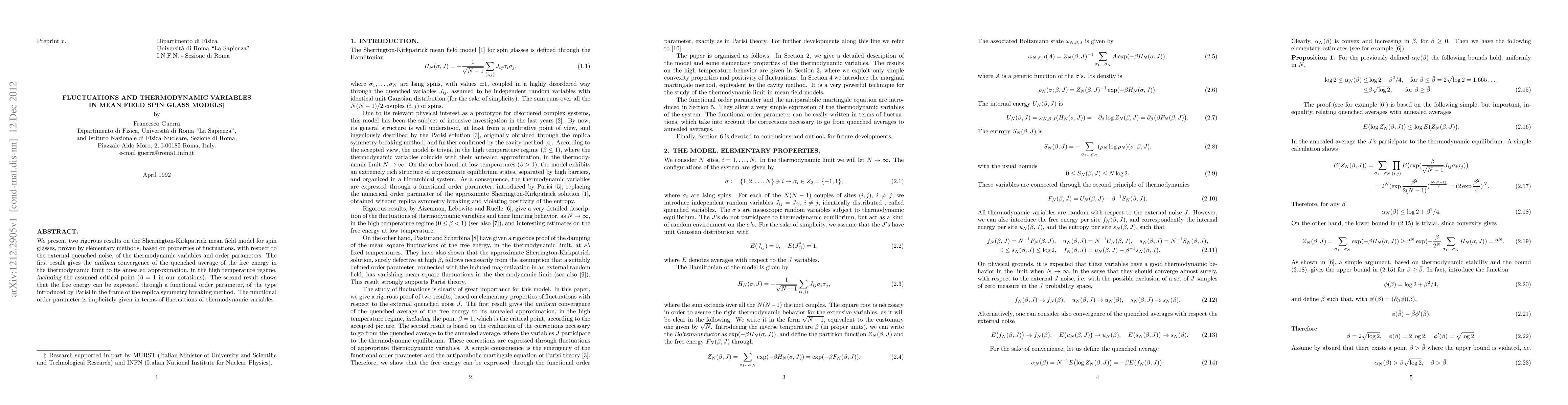 We present two rigorous results on the Sherrington-Kirkpatrick mean field model for spin glasses, proven by elementary methods, based on properties of fluctuations, with respect to the external quenched noise, of the thermodynamic variables and order parameters. The first result gives the uniform convergence of the quenched average of the free energy in the thermodynamic limit to its annealed approximation, in the high temperature regime, including the assumed critical point beta=1 in our notations. The second result shows that the free energy can be expressed through a functional order parameter, of the type introduced by Parisi in the frame of the replica symmetry breaking method. The functional order parameter is implicitely given in terms of fluctuations of thermodynamic variables.