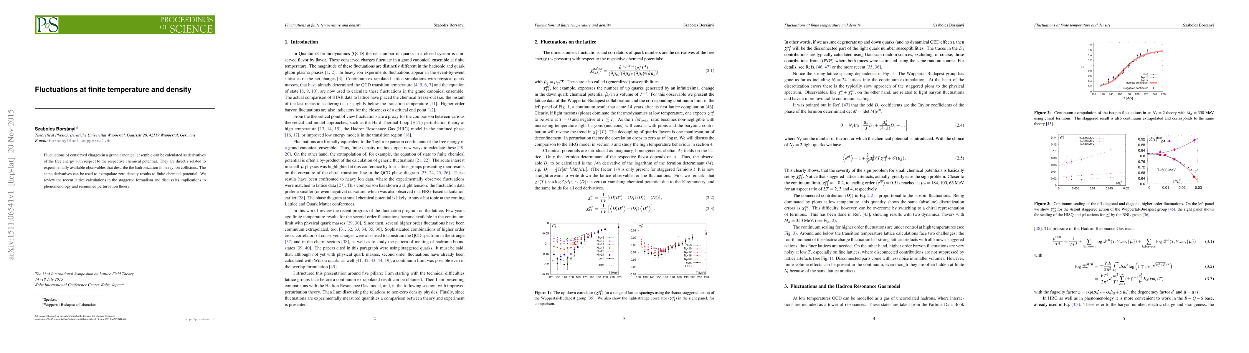 Fluctuations of conserved charges in a grand canonical ensemble can be calculated as derivatives of the free energy with respect to the respective chemical potential. They are directly related to experimentally available observables that describe the hadronization in heavy ion collisions. The same derivatives can be used to extrapolate zero density results to finite chemical potential. We review the recent lattice calculations in the staggered formalism and discuss its implications to phenomenology and resummed perturbation theory.
