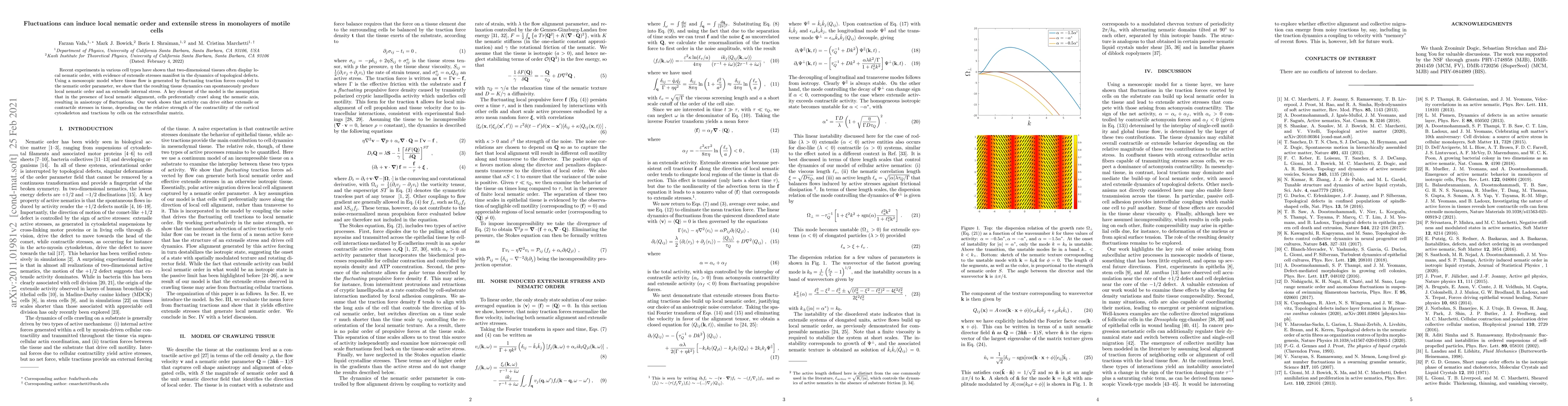 Recent experiments in various cell types have shown that two-dimensional tissues often display local nematic order, with evidence of extensile stresses manifest in the dynamics of topological defects. Using a mesoscopic model where tissue flow is generated by fluctuating traction forces coupled to the nematic order parameter, we show that the resulting tissue dynamics can spontaneously produce local nematic order and an extensile internal stress. A key element of the model is the assumption that in the presence of local nematic alignment, cells preferentially crawl along the nematic axis, resulting in anisotropy of fluctuations. Our work shows that activity can drive either extensile or contractile stresses in tissue, depending on the relative strength of the contractility of the cortical cytoskeleton and tractions by cells on the extracellular matrix.