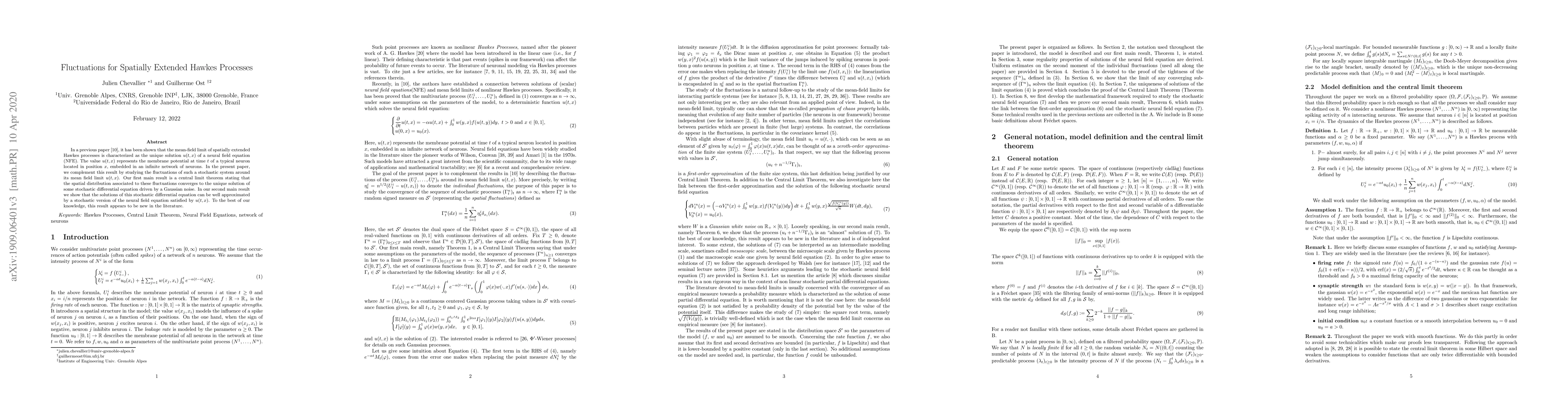 In a previous paper, it has been shown that the mean-field limit of spatially extended Hawkes processes is characterized as the unique solution $u(t,x)$ of a neural field equation (NFE). The value $u(t,x)$ represents the membrane potential at time $t$ of a typical neuron located in position $x$, embedded in an infinite network of neurons. In the present paper, we complement this result by studying the fluctuations of such a stochastic system around its mean-field limit $u(t,x)$. Our first main result is a central limit theorem stating that the spatial distribution associated with these fluctuations converges to the unique solution of some stochastic differential equation driven by a Gaussian noise. In our second main result, we show that the solutions of this stochastic differential equation can be well approximated by a stochastic version of the neural field equation satisfied by $u(t,x)$. To the best of our knowledge, this result appears to be new in the literature.